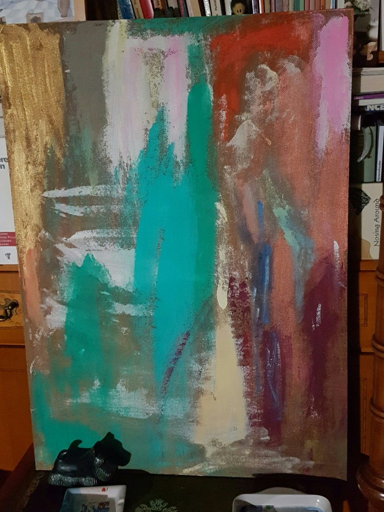 13. Oktober 2017 Abstract beauty By Yvonne Wilken Acrylic and oil on canvas This painting tells stories. Maybe I leave it like that more or less. I see a big nude and a green person with dog. I didn’t intend it. It painted itself – so to say… Teilen mit: Auf X teilen (Wird in neuem Fenster geöffnet) X Auf Facebook teilen (Wird in neuem Fenster geöffnet) Facebook Gefällt mir Wird geladen … Veröffentlicht von yvonnenodaywithoutfinearts Oberstudienrätin für Englisch und Französisch im Ruhestand. Kunstschaffend und -begeistert und reisefreudig Zeige alle Beiträge von yvonnenodaywithoutfinearts