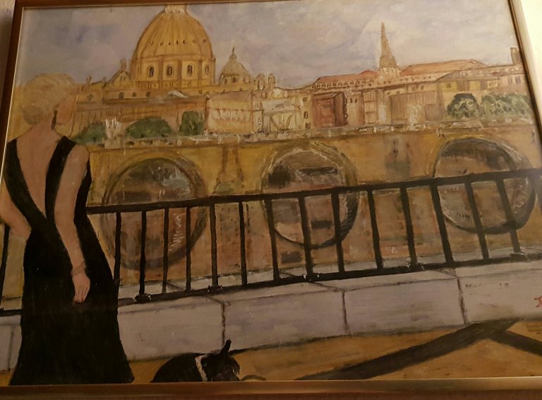 Rom. Der Tiber und eine Blondine im schwarzen Kleid und mit schwarzem schottischen Terrier… keine Frage, wo und wie meine Mutter beim Malen ihre Motive fand…