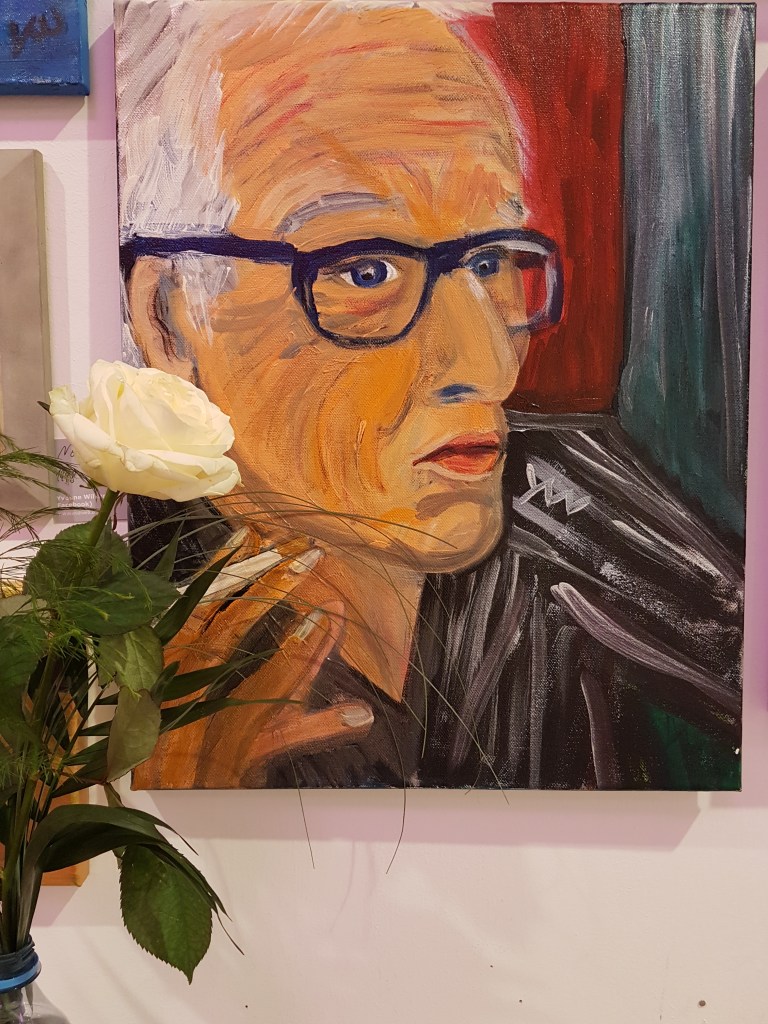 Portrait THE SMOKER (Acrylic and oil on canvas 2017) by Yvonne Wilken with white rose (Zigarette in der Kunst/la cigarette dans les beaux arts/cigarettes in ART: part 37