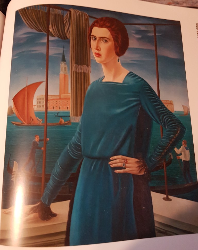 Portrait der Künstlerehefrau mit Venedig als Hintergrund. (Öl auf Leinwand – so prächtig im Samtgewand, so rätselhaft schön im Gesichtsausdruck, so stark dem Wasser und der Silhouette Venedigs angepasst) aus dem Katalog des Folkwang Museums Essen