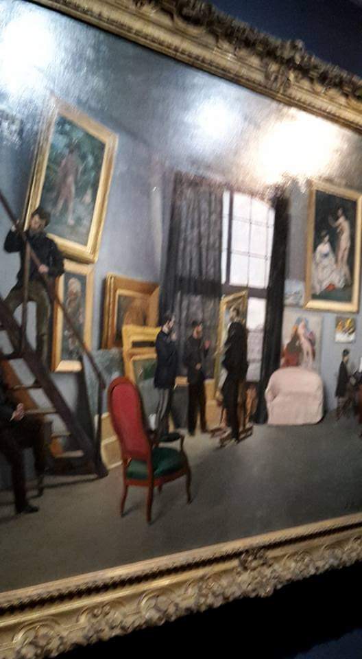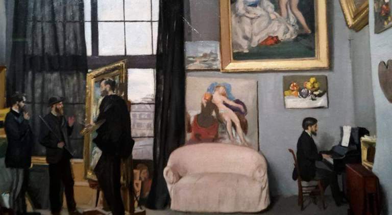 L’atelier de la rue de la Condamine (1870) – eine so perfekt gemalte Kulisse bietet dieses letzte Atelier des Künstlers, der als Wegbereiter des Impressionismus gilt – la jeunesse de l’impressionisme hieß die Ausstellung im musée d’Orsay, in der dieses Bild aus dem letzten Lebensjahr des viel zu früh im Krieg gefallenen Künstlers aus Montpellier hing. Auch die Menschen, die sich – vielleicht zu einer Vernissage dort aufhalten, sind sehr genau portraitiert und lassen sich als später berühmt gewordene Künstler identifizieren.