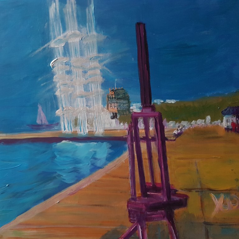 With umbrella-installation, Alexander the Great-statue and the little white tower, which is not white at all. And THE SEA, OF COURSE – INTO THE BLUE