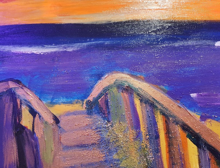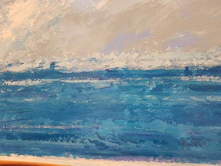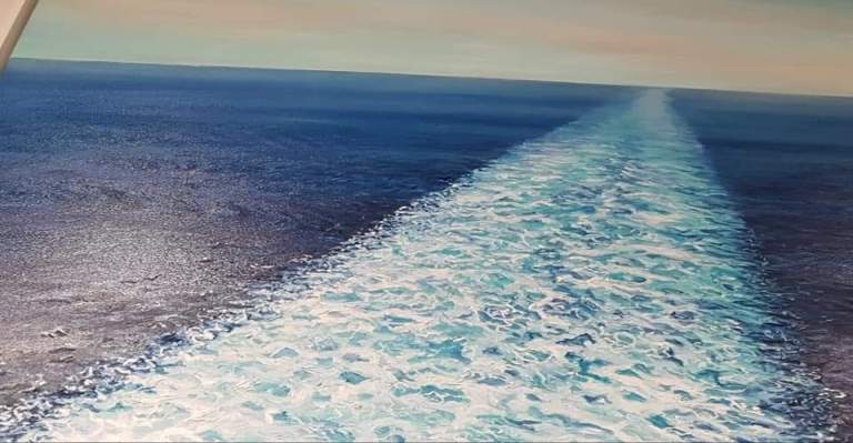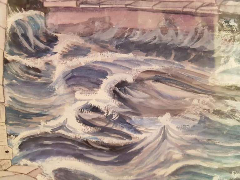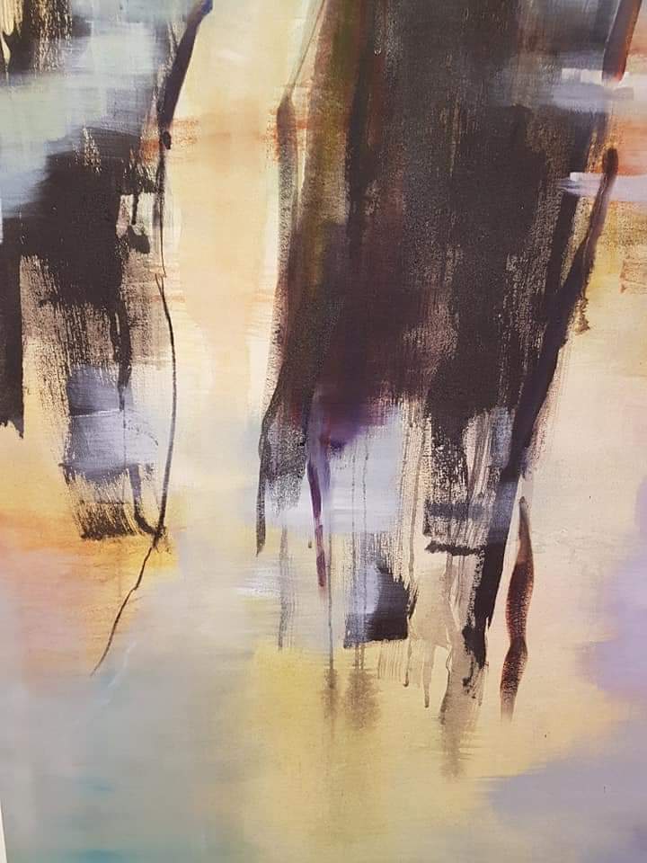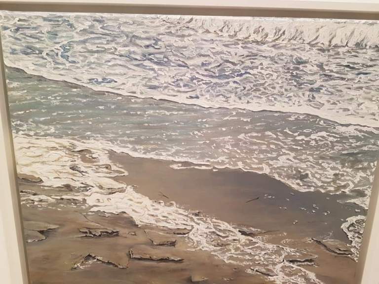 The different versions of water in our exhibition: Susanne Stoffer’s photorealistic version of tropical and Northern seas, Eva Zimnoch’s abstract Venetian water reflections, Yvonne Wilken’s (my) water colour of a river and the dark blue expressionist version of the Baltic sea, Igor Jablunowskij’s impressionist pool presentation in a photorealistic painting