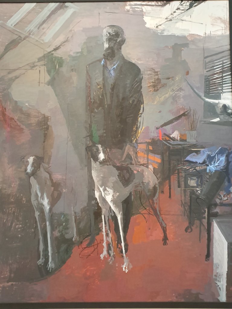ebenfalls aus der interessanten Ausstellung „Künstler der DDR“ im Museum Barberini, Potsdam: Arno Rink (1940-2017) stellt in seinem Bild von 2009/2010 nicht das Atelier in den Vordergrund, sondern den Künstler und seine 2 Windhunde (Barsois wahr0scheinlich). Was bei von Stucks Selbstportrait im Atelier (18) allerdings fast die ganze Fläche des Bildes einnimmt – das Selbstportrait – ist zwar mittig, doch zurückhaltend angelegt.