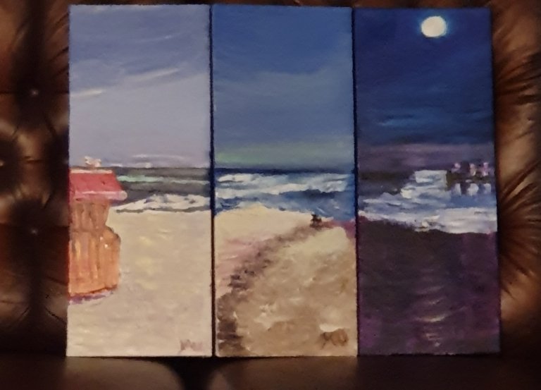 After motives of yvonnewilkenphotography 4/2019 – all in Dahme/Ostsee: in jedem dominieren andere Farben den Eindruck des Meeres (sehr typisch für die Ostsee) – außerdem habe ich 3 verschiedene Tageszeiten(Mittag/Morgen/Vollmondnacht) genommen und 3 verschiedene Lebewesen eingesetzt: Möwe/Hund/Menschen. Die Bilder beinhalten alle dieselben wenigen Farben: Beige. Braun. Rot. Blautöne. Grüntöne. Rosé und gelbliches sowie silbriges Weiß – damit das Einheitliche des Triptychons bestehen bleibt. Jedoch kann jedes Bild auch für dich allein hängen.