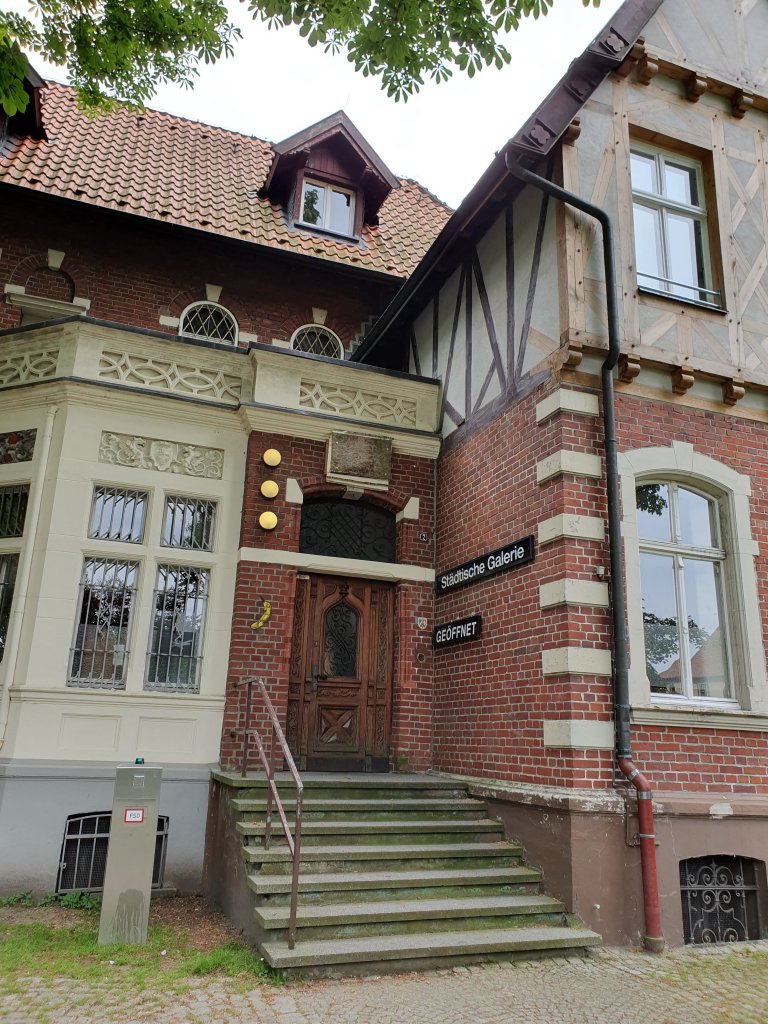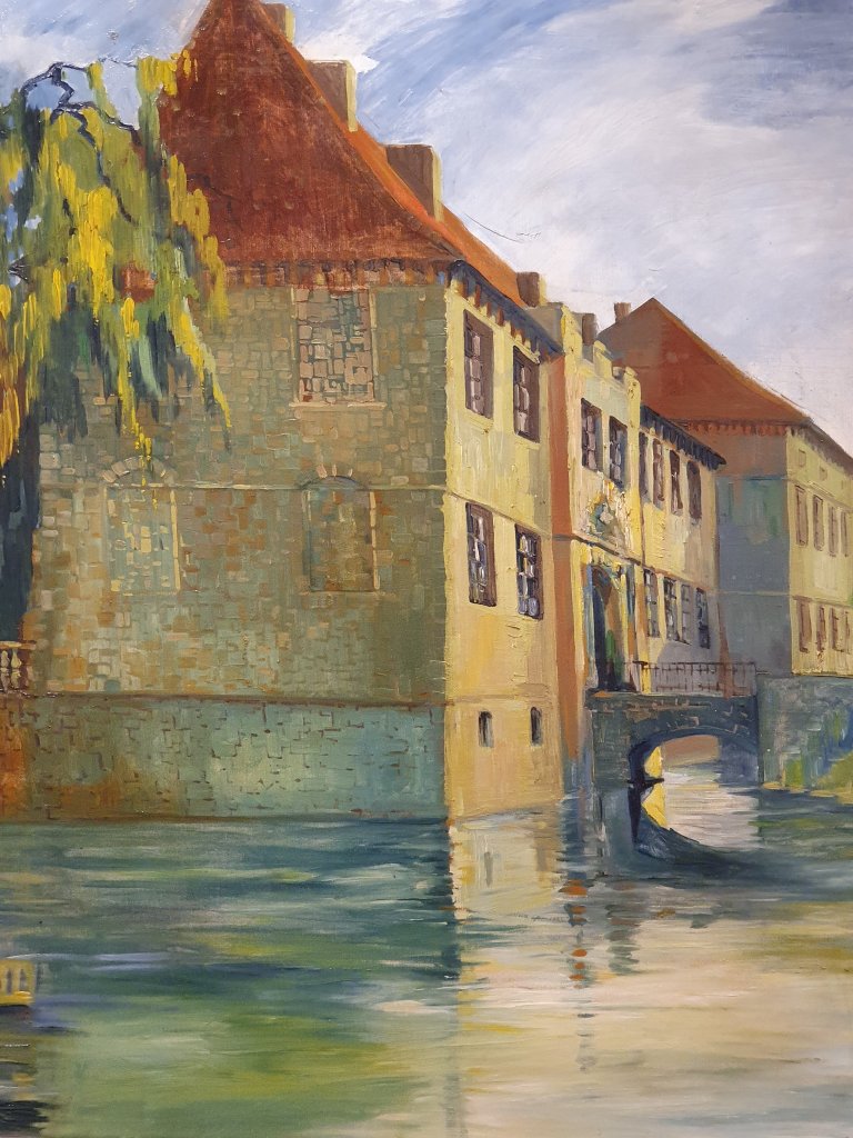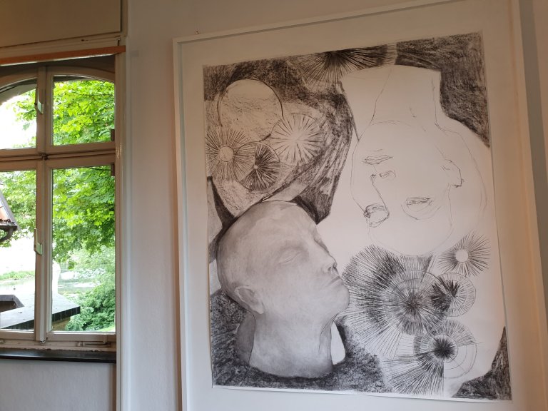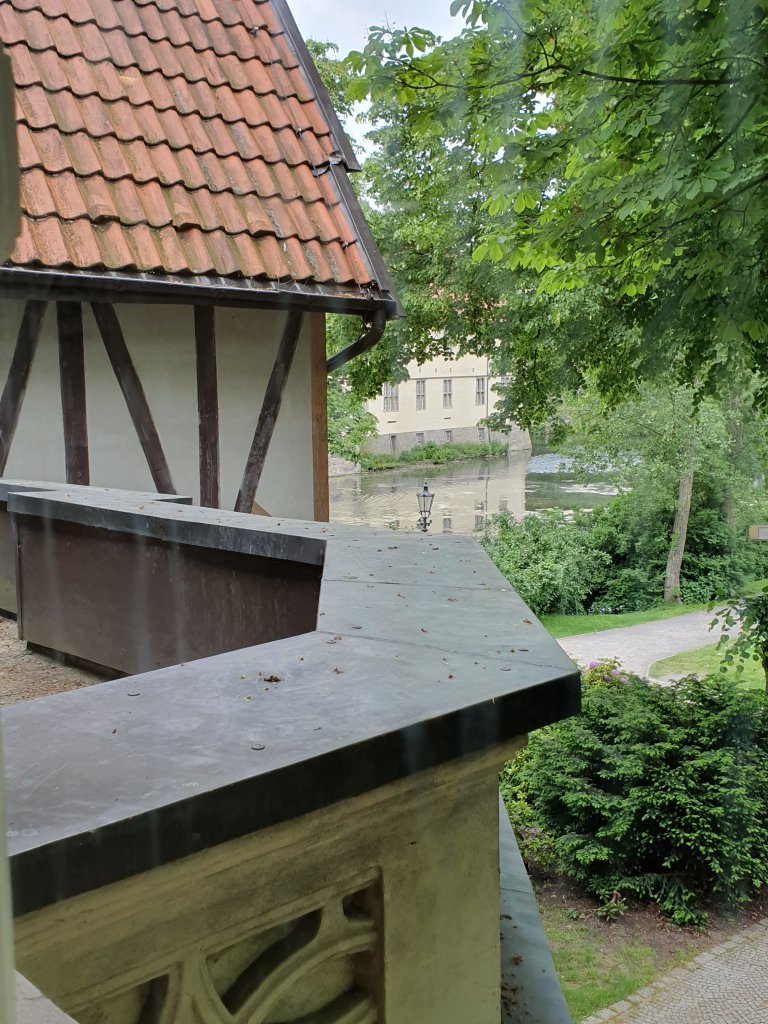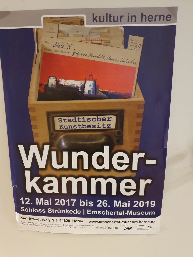 Ausstellung von Andrea Küsters Werken in der städtischen Galerie des Emschertal-Museums Schloss Strünkede – nach zu vielen kleinen schwarz-weißen Bildern (für meinen bunten Geschmack) wanderte ich in der „cosy atmosphere“ des alten Fachwerkhauses auch an bunten Werken der Künstlerin vorbei (mit dem Ausblick vom Fenster auf das größere Enschertal Museum, das Wasserschloss, das in der Ausstellung „Wunderkammer“ auch mehrmals als Modell und Motiv diente) – um als das schönste Exemplar der Küster-Ausstellung doch ein schwarzweißes zu sehen: Traum (mit den beiden Köpfen).