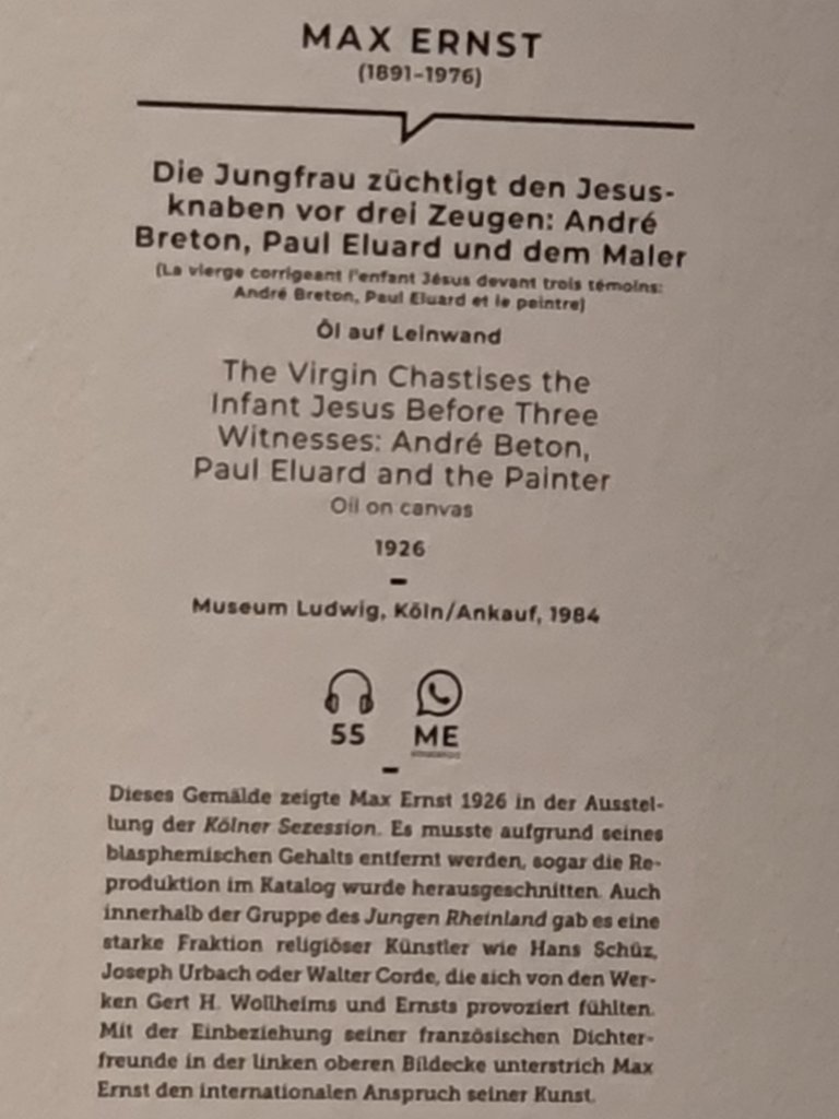 31. Mai 2019 In front of ART (23): Max Ernst at Kunstpalast Düsseldorf I love the colours and the provocation of this painting Teilen mit: Auf X teilen (Wird in neuem Fenster geöffnet) X Auf Facebook teilen (Wird in neuem Fenster geöffnet) Facebook Gefällt mir Wird geladen … Veröffentlicht von yvonnenodaywithoutfinearts Oberstudienrätin für Englisch und Französisch im Ruhestand. Kunstschaffend und -begeistert und reisefreudig Zeige alle Beiträge von yvonnenodaywithoutfinearts