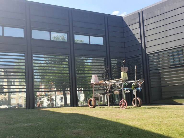 (outside the museum) Kunstmuseum Bochum. Leider war nirgendwo zu erkennen, wer diese moving movable art gemacht hat – im Stil von Jean Tinguely. Aber hübsch ist auch, wie sich die alten Villen des Bochumer Stadtparks in den großen Fenstern des Museums spiegeln…
