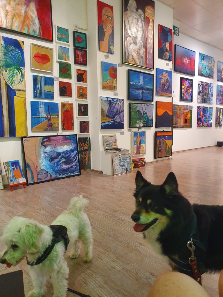 LJOMI & TIMMY in front of art by Yvonne Wilken at ART Dortmund – bei grünlichem Licht haben auch weiße Hunde einen meergrünen Schimmer
