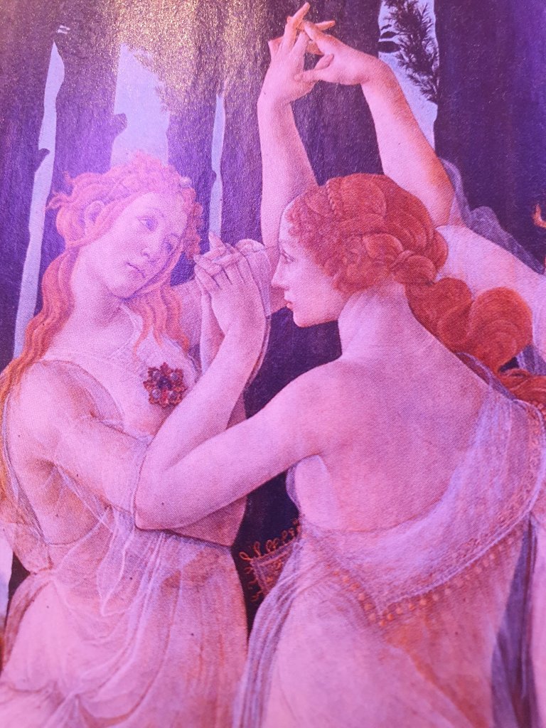 Dieses Mal leicht bekleidete Damen – vermutlich Sandro Botticellis Variante der drei Grazien – in dem unglaublich detailreichen ausdrucksstarken und rätselhaften Bild PRIMAVERA ( im Juniheft des Art Magazins)