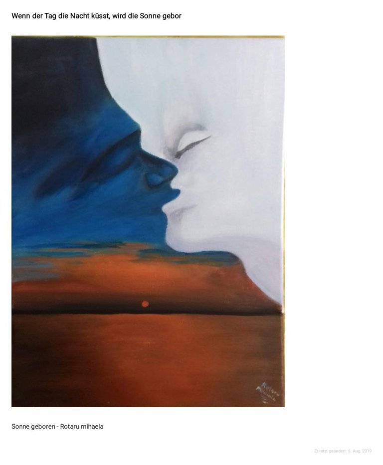 9. August 20199. August 2019 Kuss und Umarmung in der Kunst (part 167) by Mihaela Rotaru: wenn der Tag die Nacht küsst… Teilen mit: Auf X teilen (Wird in neuem Fenster geöffnet) X Auf Facebook teilen (Wird in neuem Fenster geöffnet) Facebook Gefällt mir Wird geladen … Veröffentlicht von yvonnenodaywithoutfinearts Oberstudienrätin für Englisch und Französisch im Ruhestand. Kunstschaffend und -begeistert und reisefreudig Zeige alle Beiträge von yvonnenodaywithoutfinearts