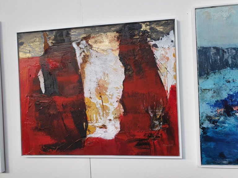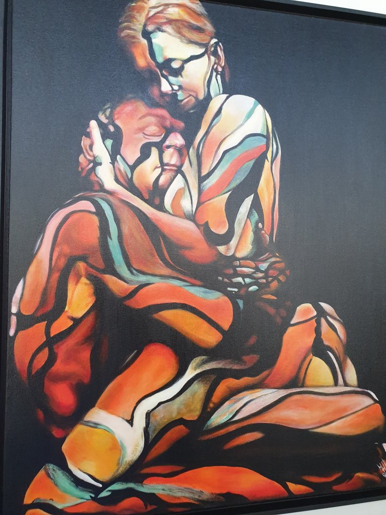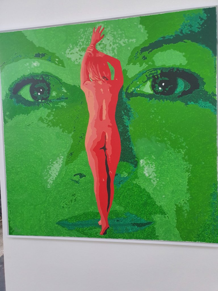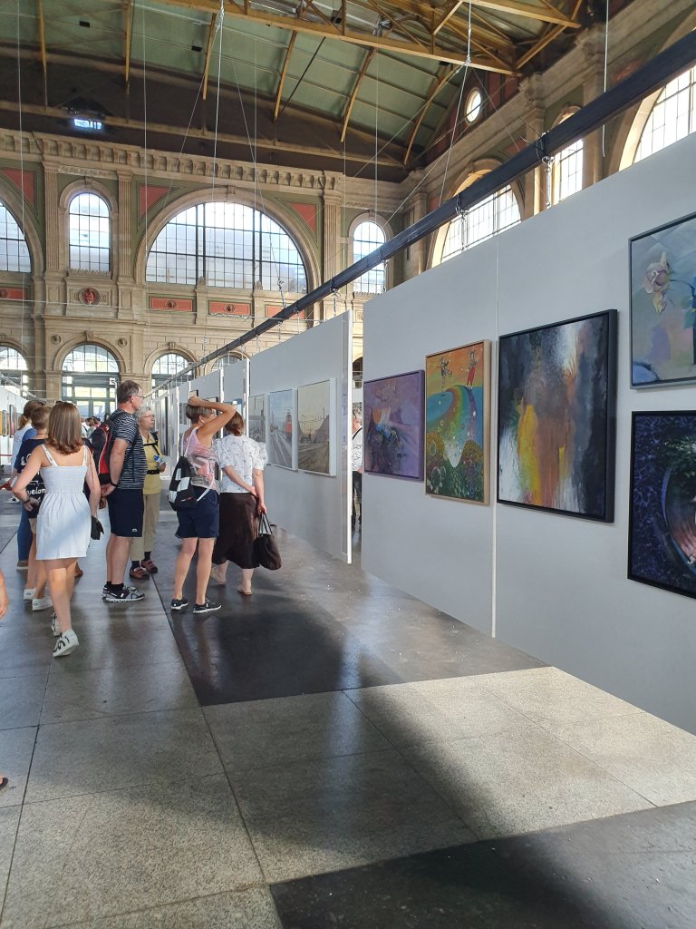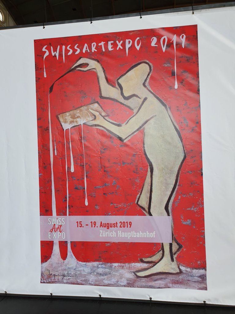 Ausstellung SWISS ART EXPO mit vielen (nicht nur die 10 Finalisten der Artbox Ausschreibung) Künstlern, nicht nur im flatscreen, der gestern noch nicht funktionierte. Im Bild figurative Kunst von Pesche Kohler (body and face), Julia Manolova (love), Olga Schibli (watching the sea) und eher abstrakte Kunst wie von meiner Luzerner Freundin Maura Patrizia Zoller und den teilweise runden geometrischen digitalen Bildern von Pedro Blas