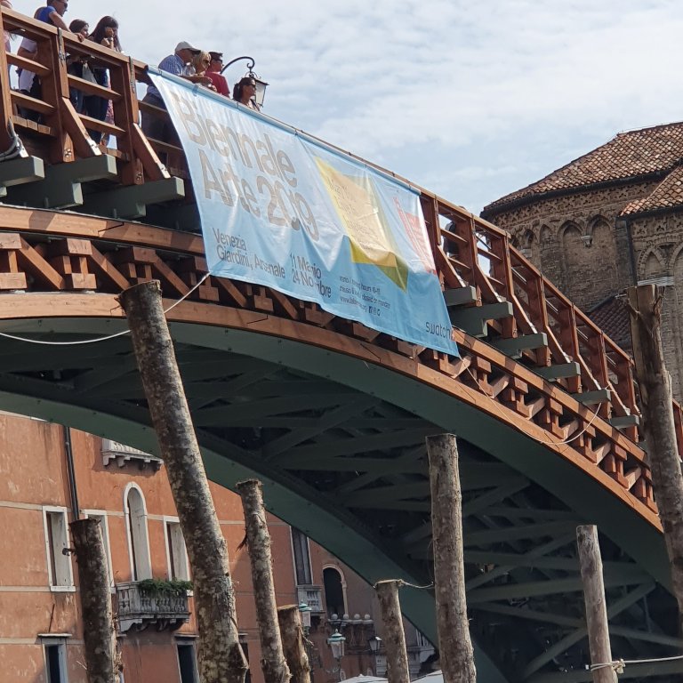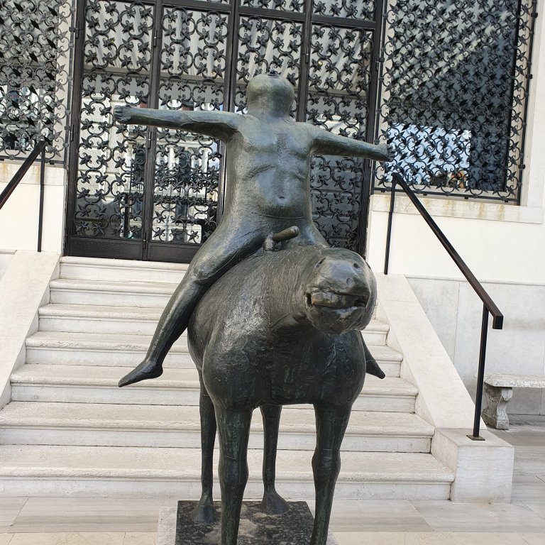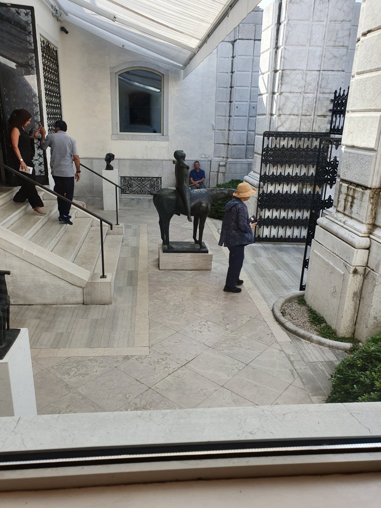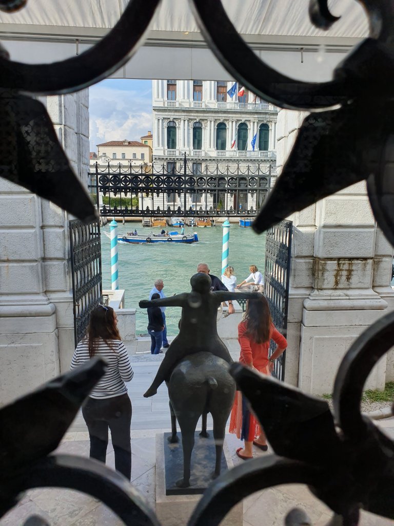 Nein, ich bin nicht von Venedig aus nach Hause geritten, obwohl ein so verwegen grinsender Gaul schon nett wäre…kein Wunder, dass sich MARINO MARINIS „Angel of the city“ so offensichtlich wohl fühlt 😉😊… auch die pummelige Dame im Caféhof ist von iihm. Beide stehen in den Höfen um das Peggy Guggenheim Museum, das die Gründerin einst selbst bewohnte und das man genau wie die Galleria Academia über die interessant gebaute Akademiebrücke erreicht, auf der in diesen Monaten das Banner mit dem Motto der Biennale hängt. Ich trage es auch: „May You Live In Interesting Times“