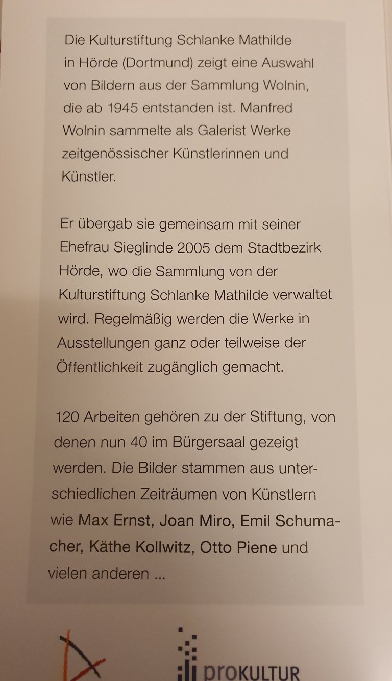 Leider nur noch heute: die Sammlung Wolnin im Hörder Bürgersaal: 40 Arbeiten aus der Stiftung von regional bis international bekannten Künstlern (ERICH KRIAN mit „Baum im Wind“. VICTOR VAZARELY und PIERRE SOULAGES)