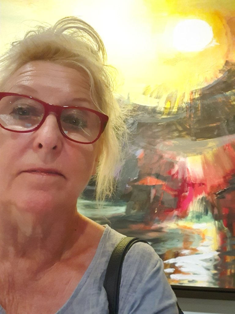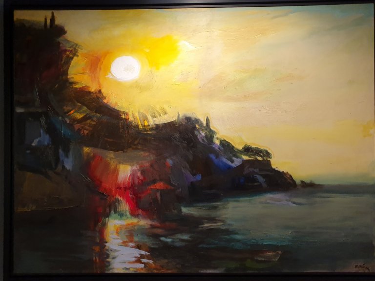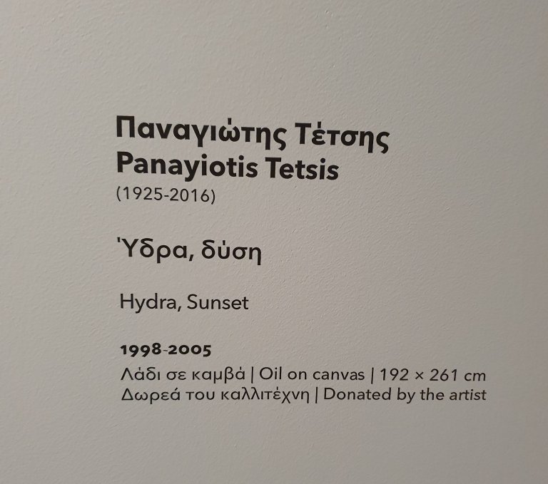 by Panayiotis Tetsis – ein Gemälde, das mich in der obersten Etage (zeitgenössische griechische Kunst) des vorgestern erst eröffneten Museums Basil & Elise Goulandris Foundation in Athen besonders faszinierte – durch seine mitreißenden Farben, die mich förmlich ins Bild gezogen haben und seinen Titel „Hydra, sunset“, die Insel, die ich gerne besucht hätte (leider keine Zeit mehr) – wegen ihrer Schönheit und ihrer Beziehung zu meinem von mir mehrfach porträtierten Lieblingssänger Leonard Cohen. Ich muss also wiederkommen nach Athen – wegen der faszinierenden Lebendigkeit, des lebhaften Kunstlebens, des warmen Klimas und der Möglichkeit, von Piräus aus nach Hydra zu fahren…
