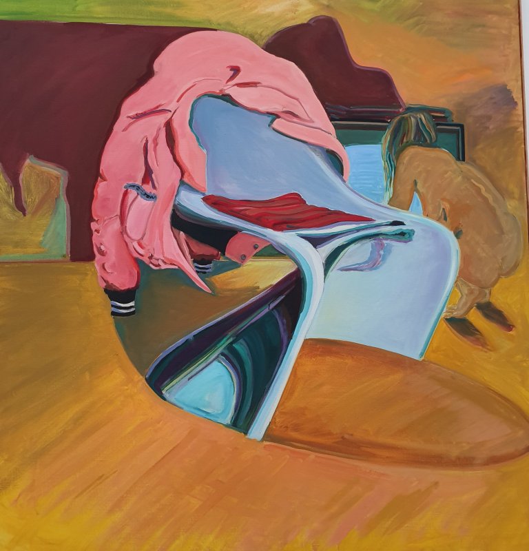 The title is „red jacket“ 1975 (oil on canvas) – which is not at all true…the jacket is more pink than red, there are really red objects visible in the painting, but all of them are not important for the onlooker – the only person, a naked woman, in front of a TV catches much more the eye.