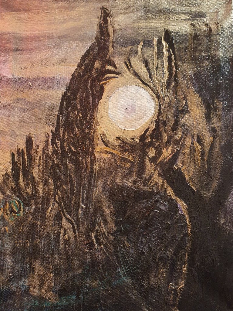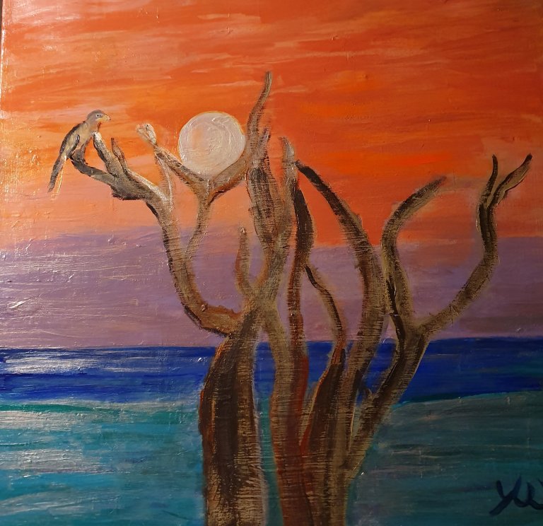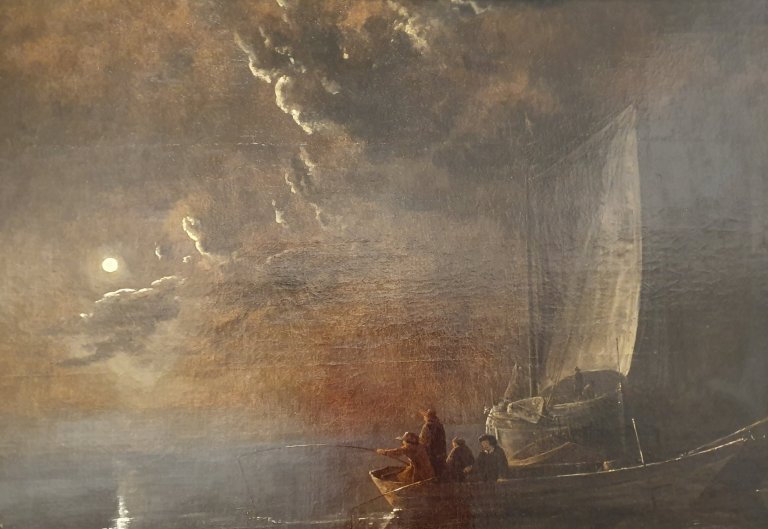 By Yvonne Wilken „terrific tree, full moon“, „korsischer Rotmilan betrachtet das Gestirn“, by ODILON REDON (1840 – 1916) „barque au clair de lune“ und Albert Cuyp (1640 – 1691) Mondlandschaft mit Fischerboot – letztere im Museum unter Tage Bochum. By Gabriele Münter (1940) „aufgehender Mond“