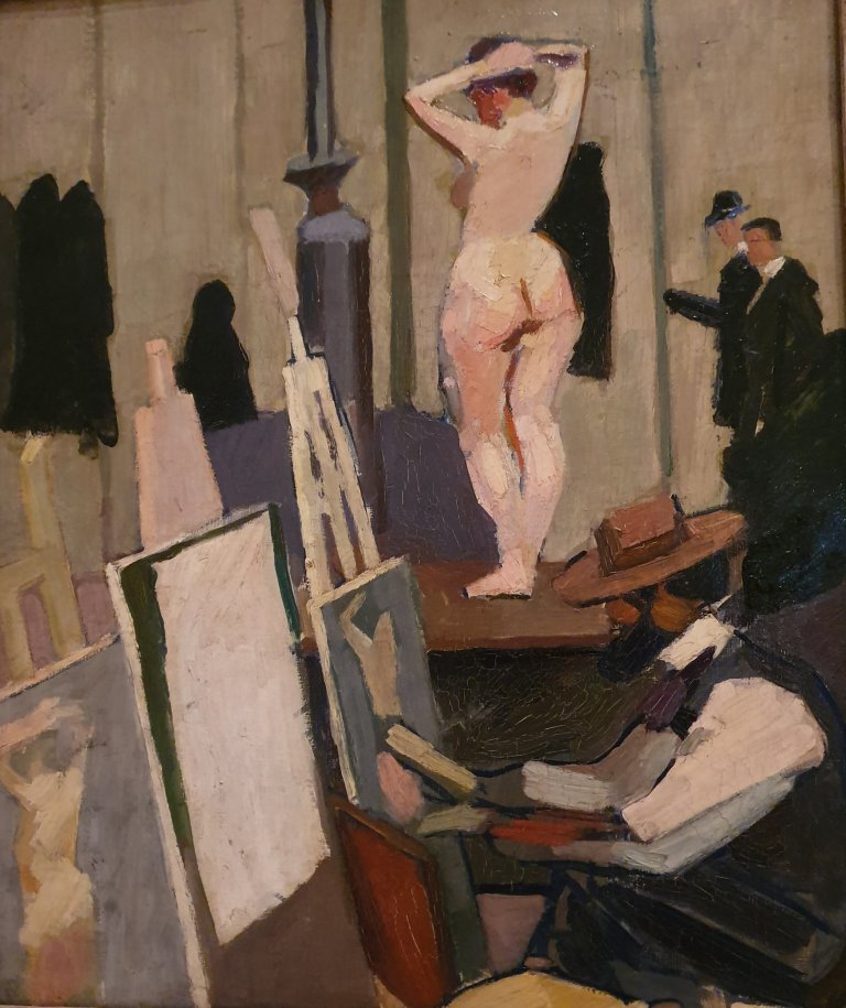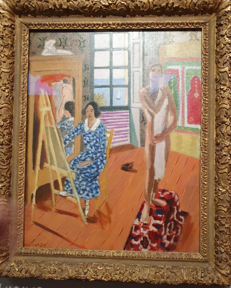 Zum 2. Advent zurück in meinem „Atelier“ fallen mir 2 malerische Atelierschilderungen ein, die ich im November (Im Rausch der Farbe, Picassomuseum Münster) und Dezember (Inspiration Matisse, Kunsthalle Mannheim – fotografiert, ehe ich das Fotoverbot bemerkte) sah: Henri Matisse, la séance de trois heures (1924) und Maurice Marinot, Atelierstudie (1904) – beide Künstler gehörten der zeitlich kurzen, von mir überaus geliebten Strömung der FAUVES an, die die Farbe möglichst unverdünnt auf ihre Leinwand brachten und damit einen damals „wilden raubtierhaften“ (=fauve) Eindruck hinterließen…sprachlich amüsant, dass der französische Titel von Henri Matisse sowohl eine Sitzung bedeuten kann, die um 3 Uhr beginnt als auch, die 3 Stunden dauert. Oft hat Matisse seinen Bildern etwas rätselhafte, unerwartete Titel gegeben…