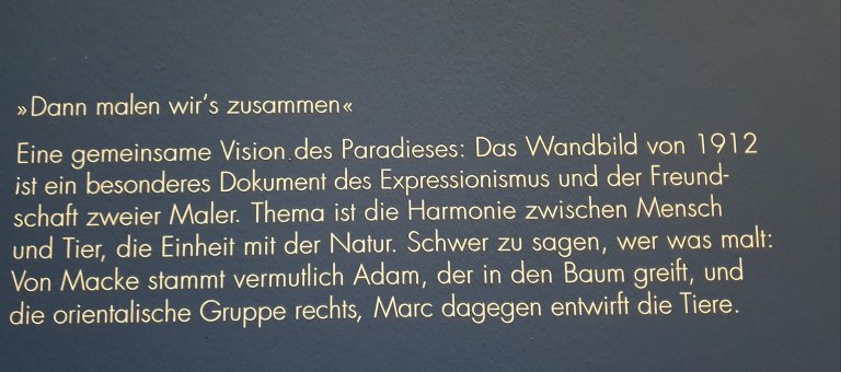 12. Januar 202012. Januar 2020 Adam and Eve (6) by August Macke/Franz Marc 1912 Wandbild „Paradies“ @ LWL Museum Münster Teilen mit: Auf X teilen (Wird in neuem Fenster geöffnet) X Auf Facebook teilen (Wird in neuem Fenster geöffnet) Facebook Gefällt mir Wird geladen … Veröffentlicht von yvonnenodaywithoutfinearts Oberstudienrätin für Englisch und Französisch im Ruhestand. Kunstschaffend und -begeistert und reisefreudig Zeige alle Beiträge von yvonnenodaywithoutfinearts
