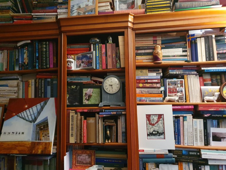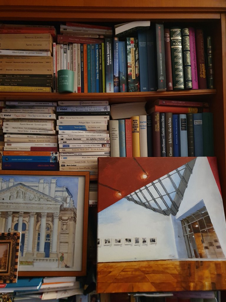 „Inside the museum“ MKK by Peter Kröker, part of the „Bank of England“ by Yvonne Wilken (water colour), a postcard of a work by Henri van Noordenburg