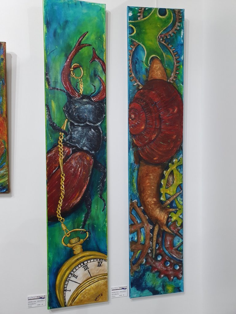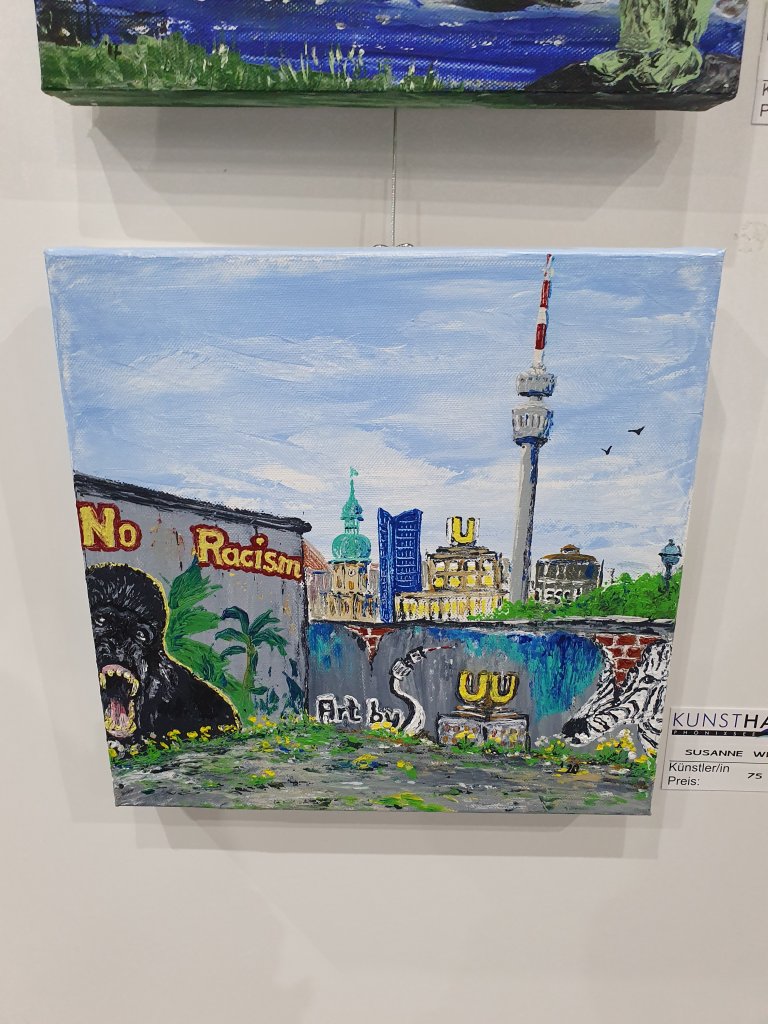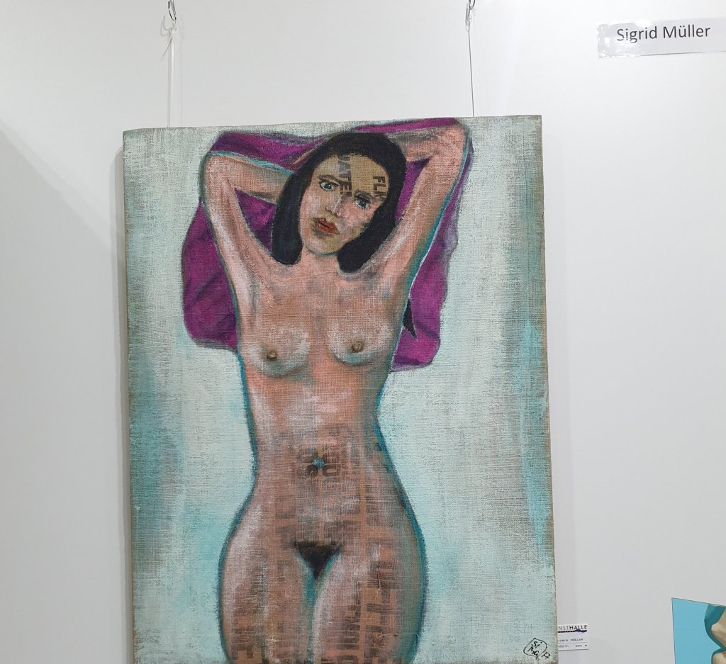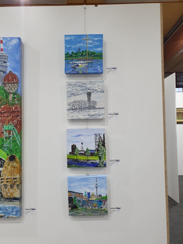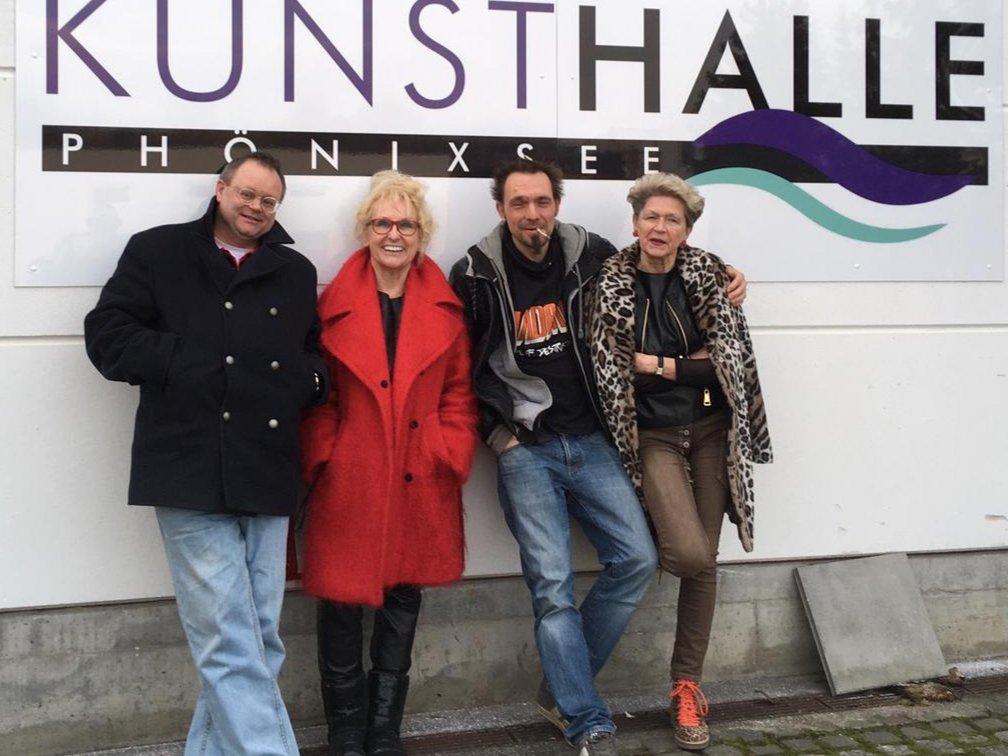 Neues von der Kunsthalle Am Phönixsee: vor unserem neuen Schild: von links nach rechts: Rainer Seifert/Yvonne Wilken/Pascal Olders/Brigitte Koch – in ihren Werken hier vertreten: Sigrid Müller (Akt auf bedrucktem Sackleinen) und Angelika Naujoks (Getier und Uhren) sowie Susanne Weiß mit spannenden, sehr aktuellen Dortmund-Motiven