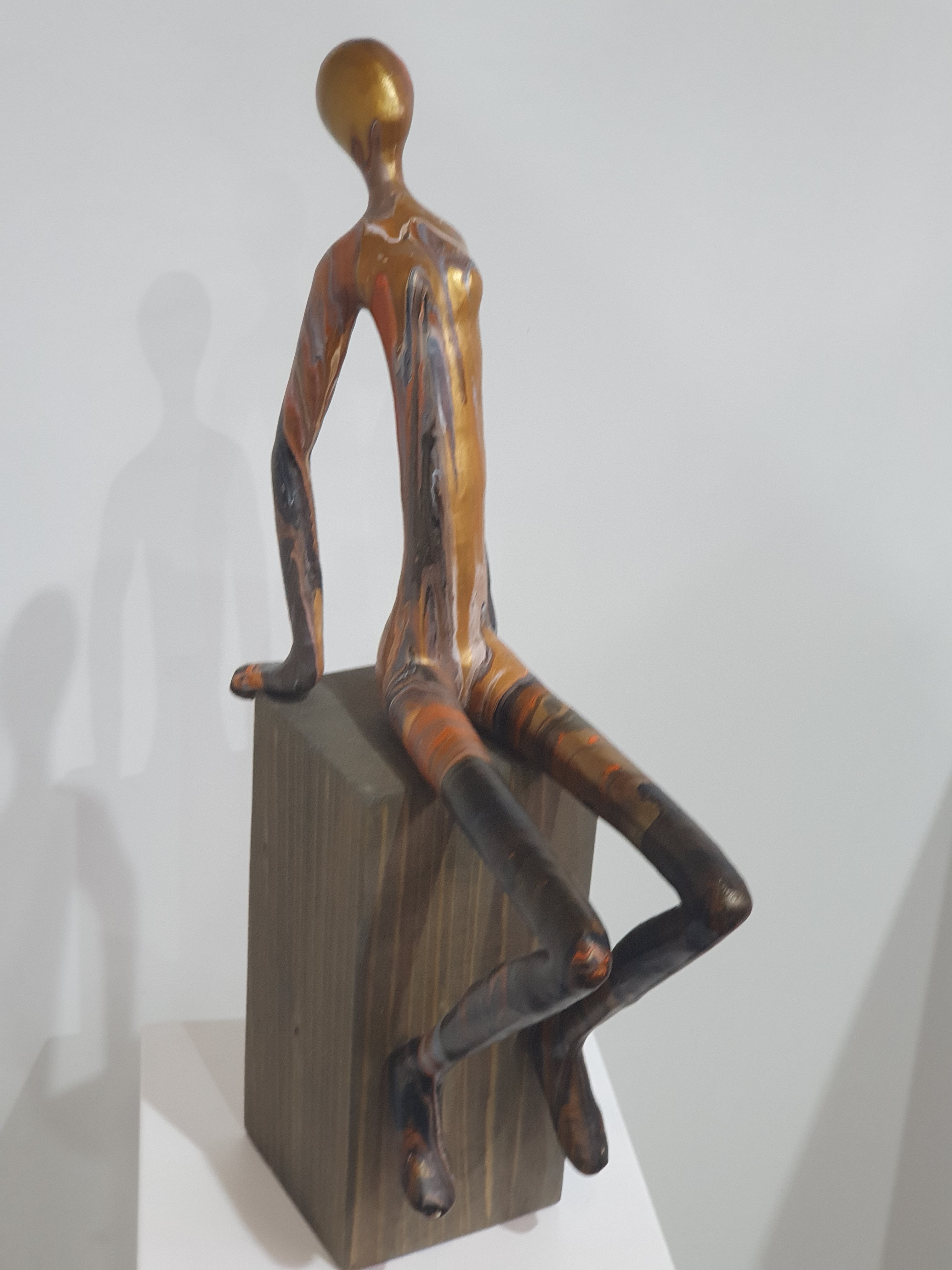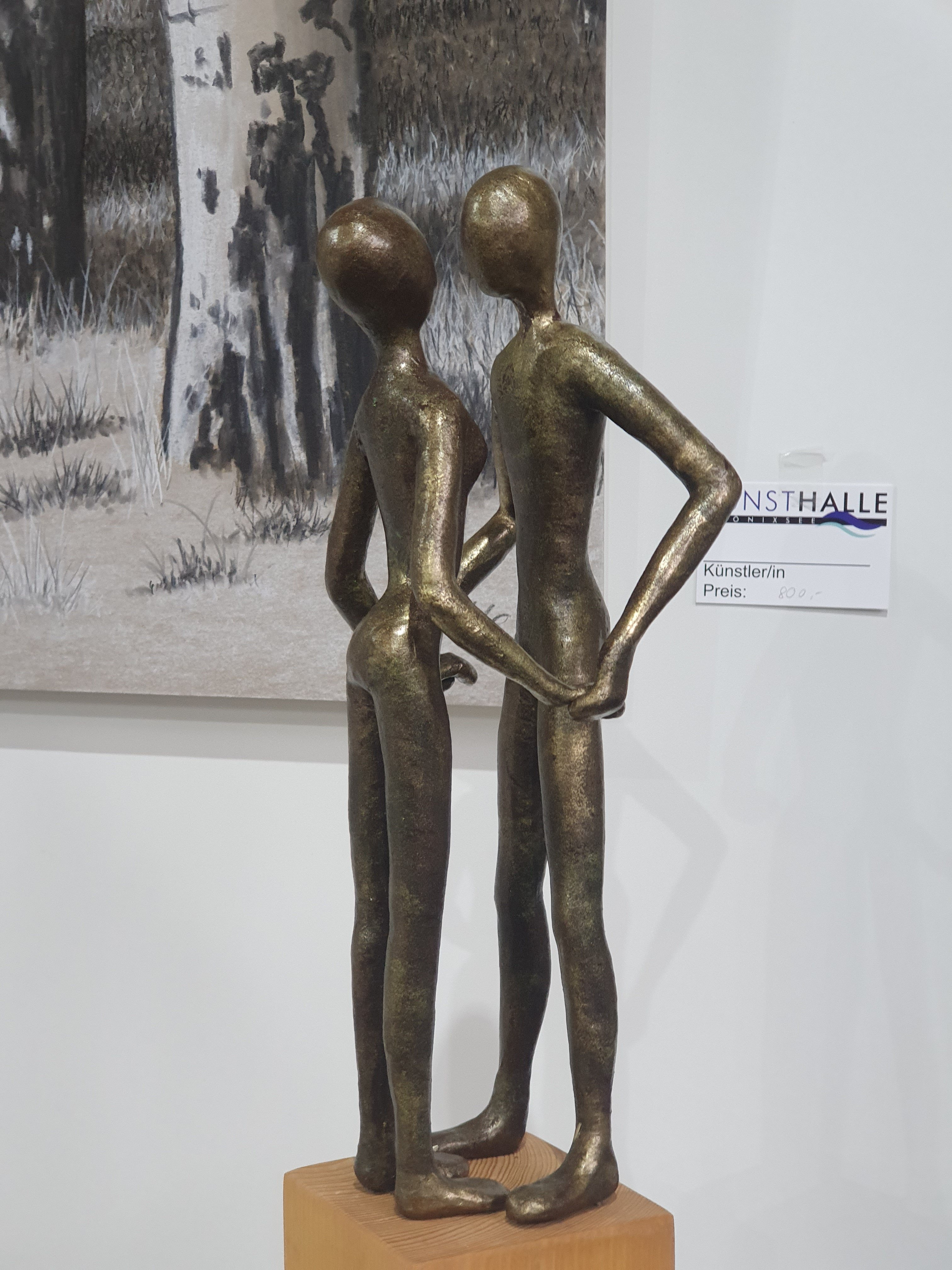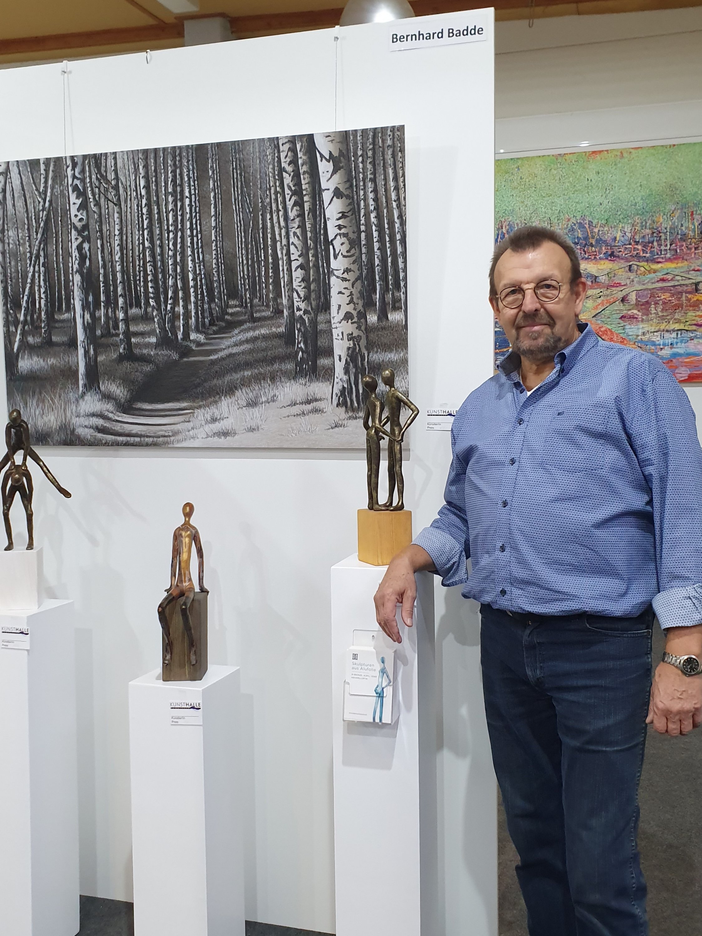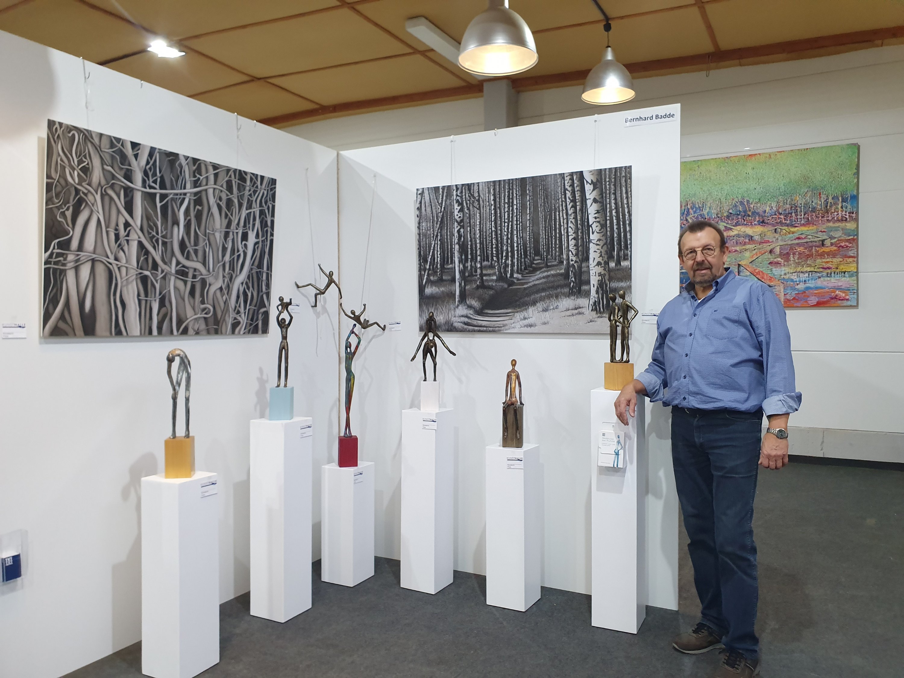 Bernhard Badde mit exquisiten Baumbildern und sehr spannenden, edel aussehenden Skulpturen, deren Leichtigkeit durch Alufolie erzeugt wird