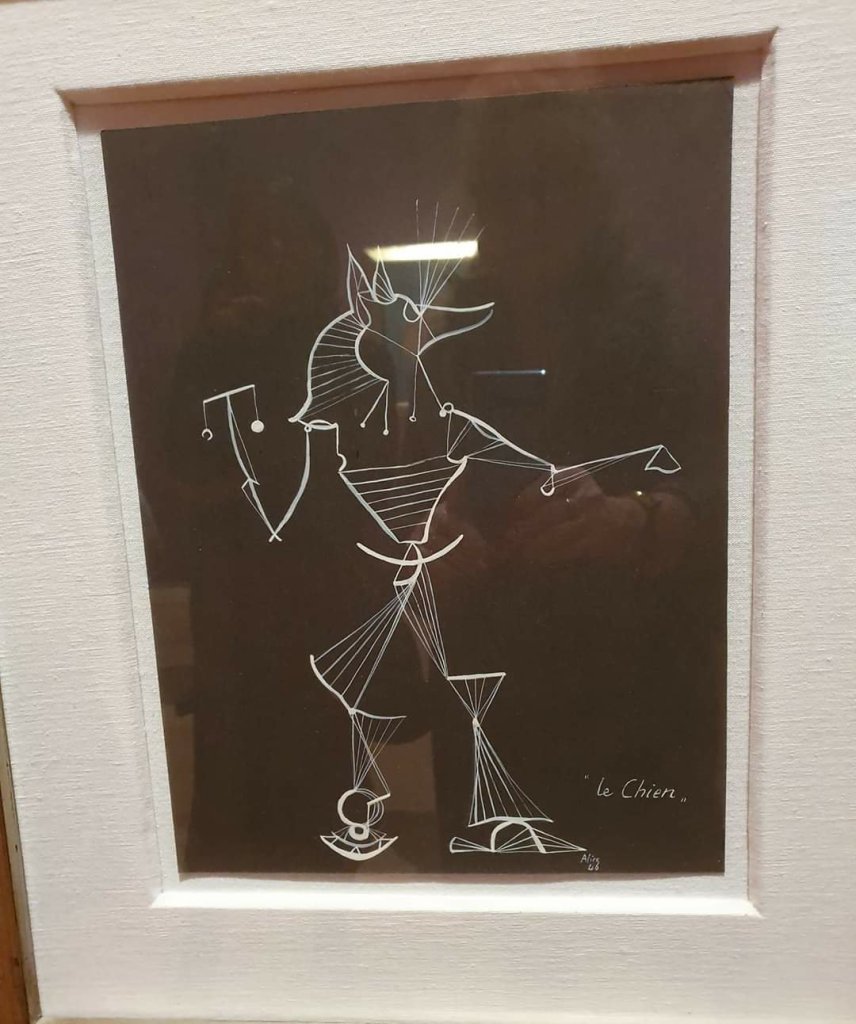 aus der vorletzten Ausstellung, die ich besuchte „Fantastische Frauen“ @ SCHIRN KUNSTHALLE FRANKFURT: Alice Rahon, le chien 1946, weiße Tusche auf schwarzem Papier (der starke weiße Strich oben dürfte eine Spiegelung sein)