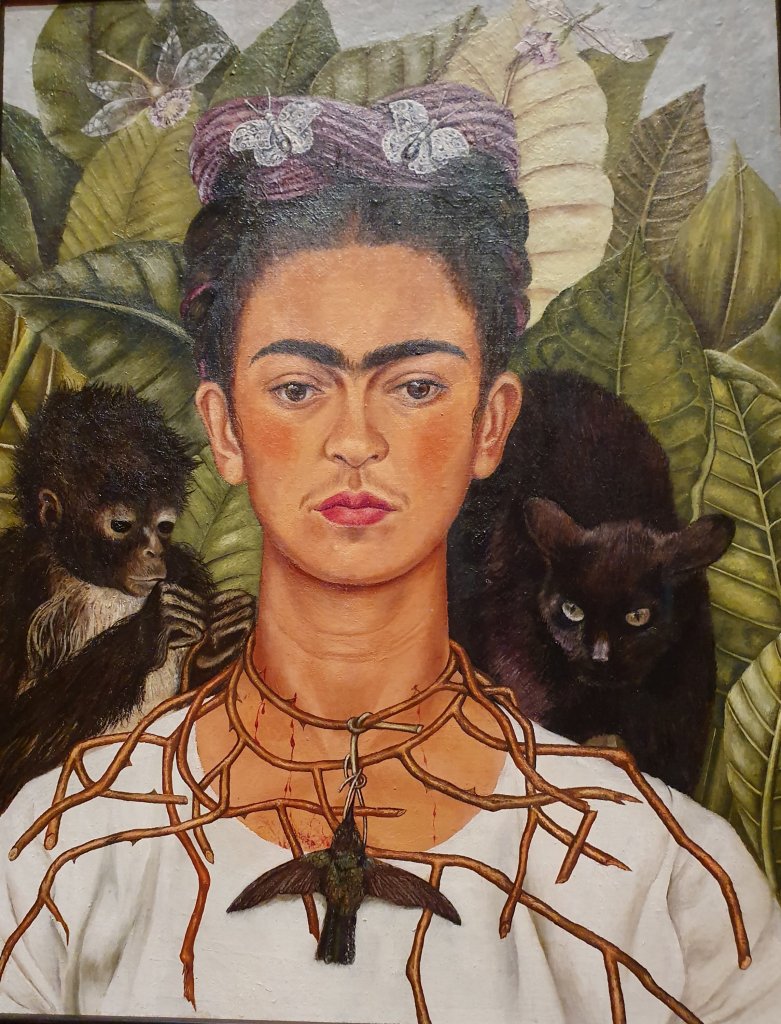 Selbstportrait von Frida Kahlo von 1940 – mit einer Reihe von Tieren: Kolibri am Dornenhalsband, ihr Lieblingsäffchen (ein Geschenk von Diego Rivera), eine schwarze Katze und Schmetterlinge über ihr – gesehen Anfang März in der Schirn Kunsthalle Frankfurt