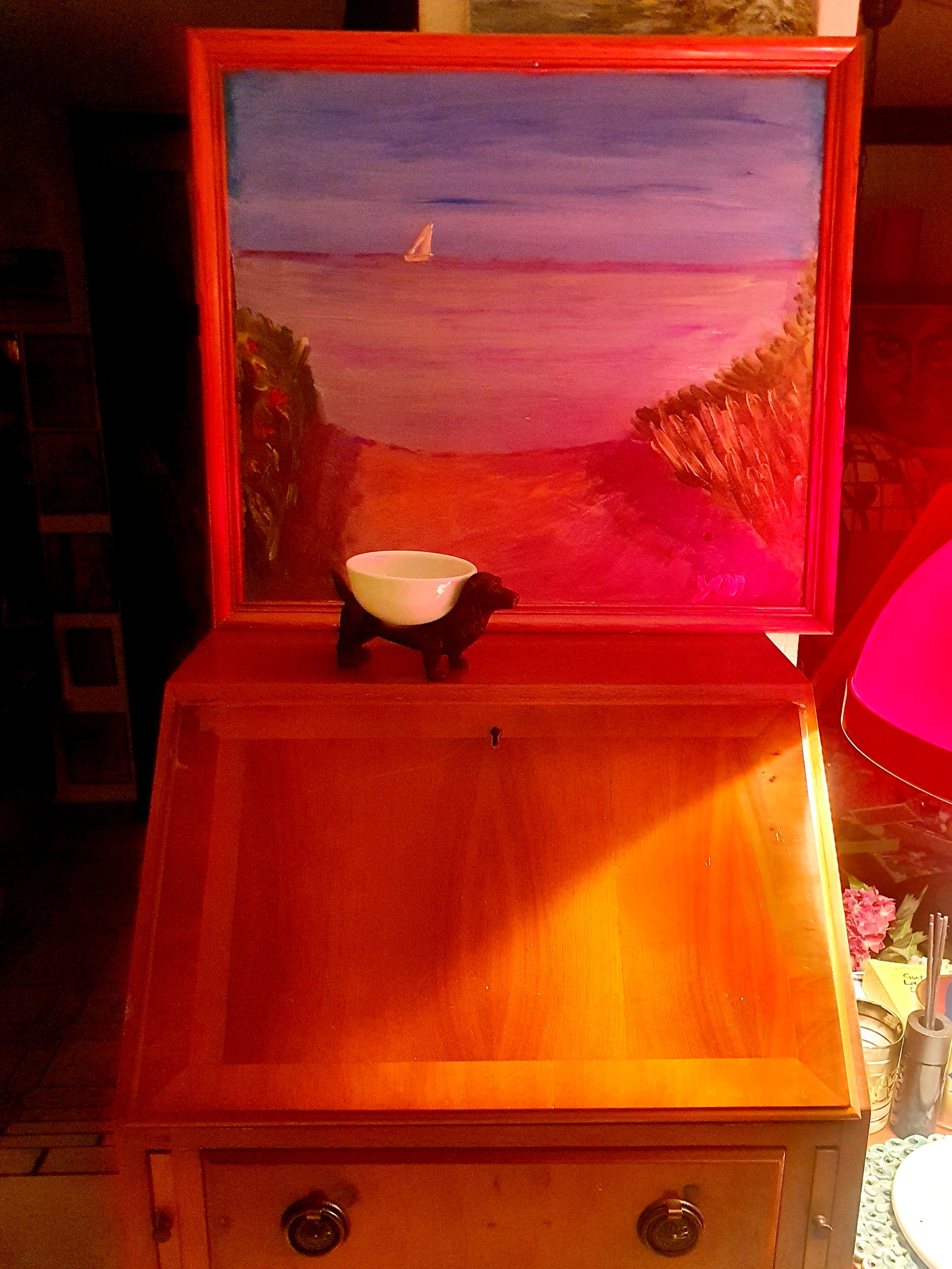 das 1. Gemälde, das von meiner Ostseereise des letzten Monats inspiriert ist, das „sensational“ bezieht sich hierbei auf die sensationellen Farben, die die Ostsee mir bot (es werden weitere Bilder folgen, denn die Lübecker Bucht stellte sich jeden Tag in anderen Farben dar)): „Mohnfeld am Meer zwischen Dahme und Kellenhusen“, Acryl auf Leinwand, 50 x 45, mit einem 70jährigen Rahmen