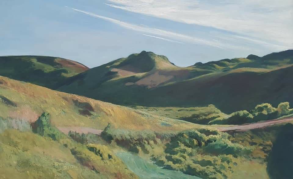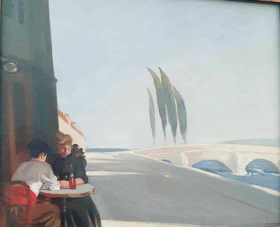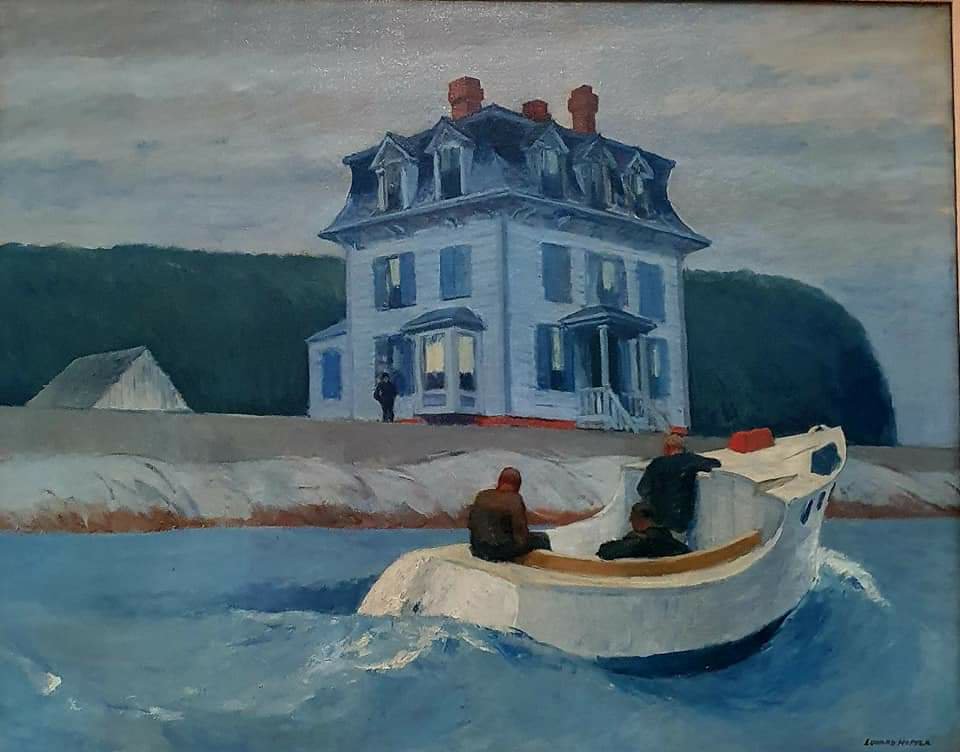 die Ausstellung baut sich chronologisch auf und zeigt zwar auch einige der berühmten Hopper-Einsamkeits -Bilder, die zum Teil nicht fotografiert werden dürfen, doch auch die weniger bekannten, die ebenfalls Geschichten erzählen – wie die der Schmuggler, die von einem einzelnen beleuchteten Fenster beobachtet werden, oder das einzige erotisch angehauchte der wartenden, dekolletierten Blondine in der Haustür – oder auch einfach nur Ruhe vermitteln mit tiefen Blau- und verschiedensten Grüntönen – hier meine subjektive Auswahl durch genau 40 Jahre: le Bistro (1909)/Bootleggers (1925) Camel’s Hump (1931), Lee Shore (1941), High Noon (1949)
