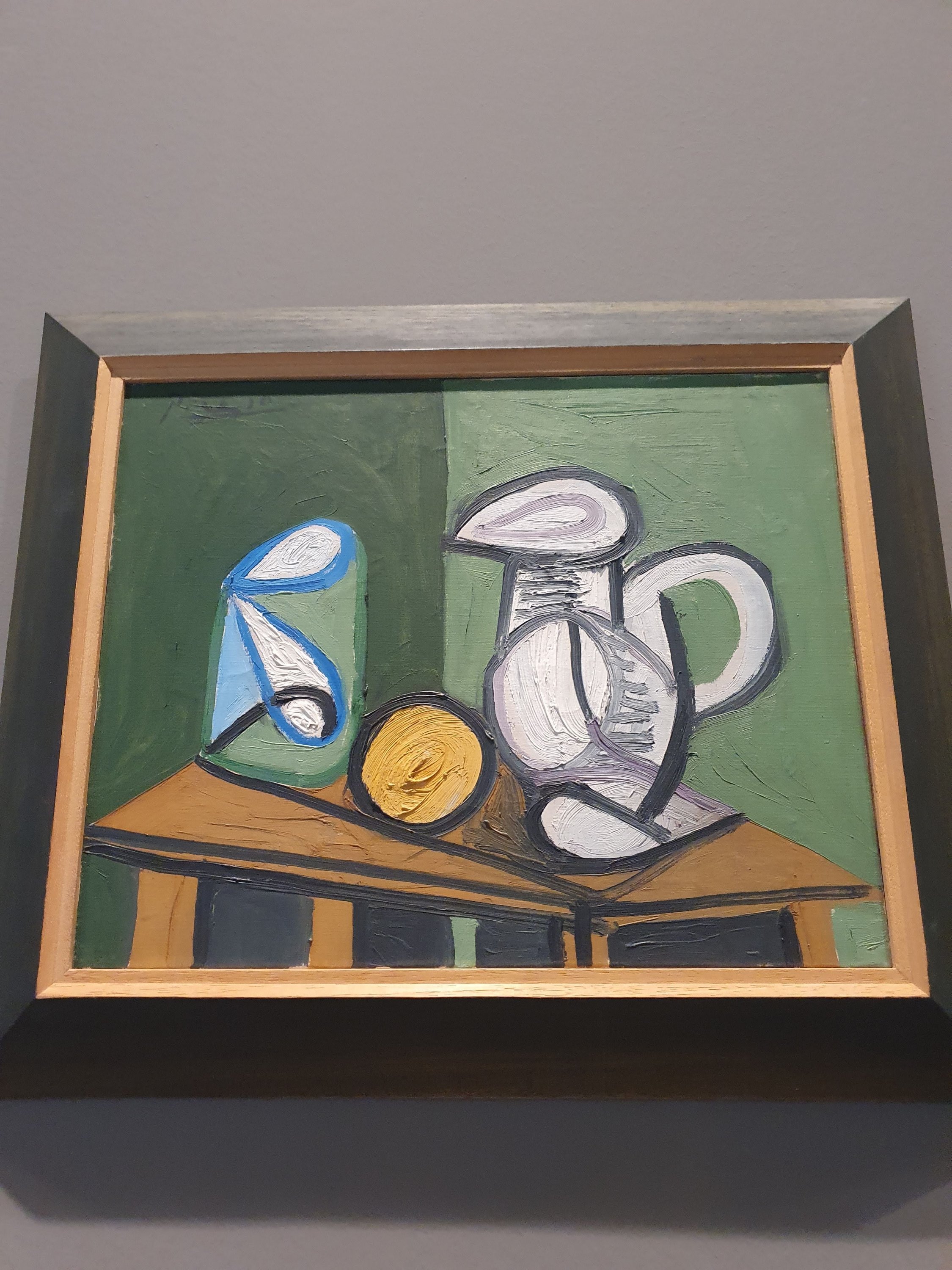 weil es so gut zum Entstehungsdatum passt (Picasso signierte seine Bilder während des 2. Weltkriegs mit dem Datum, um deutlich zu machen, dass sein Malen und seine Motive etwas mit seinem Umfeld und seiner Zeit zu tun haben) vom 23.7.1944: Pablo Picasso, nature morte pot, verre et orange – gesehen im Mai 2020 K20 Kunstsammlung NRW