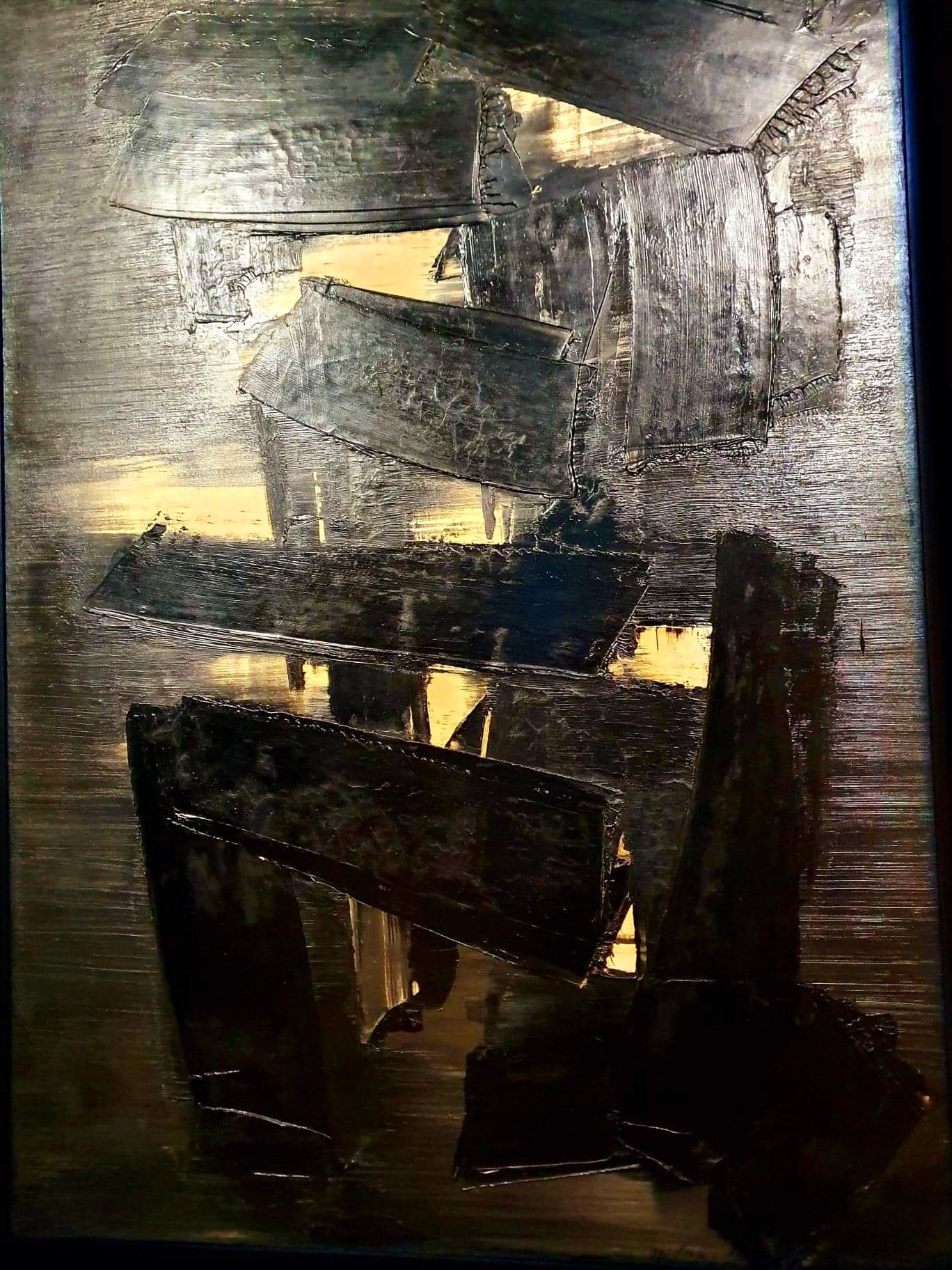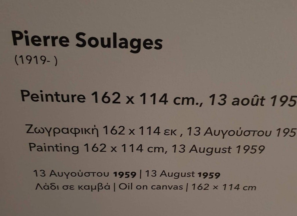 Mit unglaublich viel Tiefe – die großen abstrakten Bilder von Pierre Soulages, der 100jährig (geboren am 24.12.1919) in Paris und Sète lebt. Dieses wirkungsvolle, sehr große, am 13. August 1959 (Datum gehört zum Titel) entstandene schwarz-gelbe Bild mit den charakteristischen Balken sah ich letztes Jahr in Athen, in der Basil + Elise Goulandris Foundation.