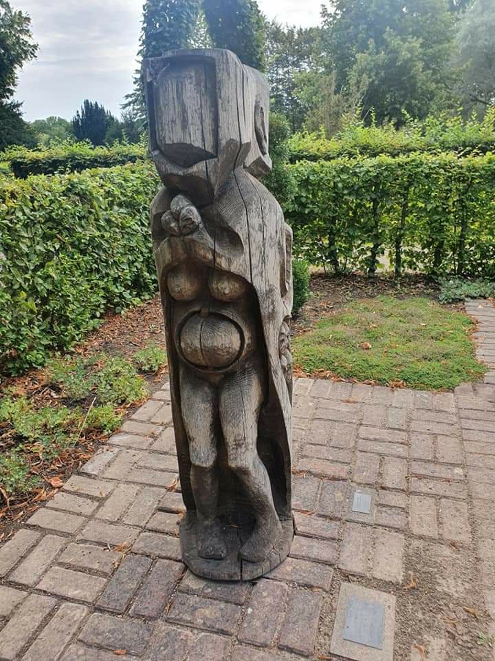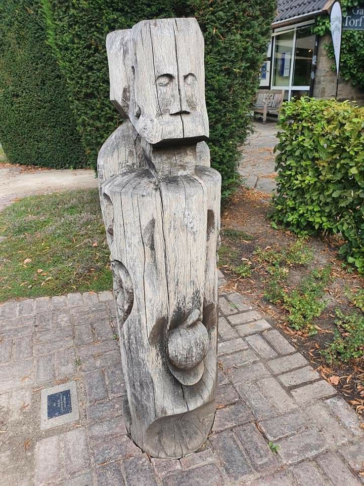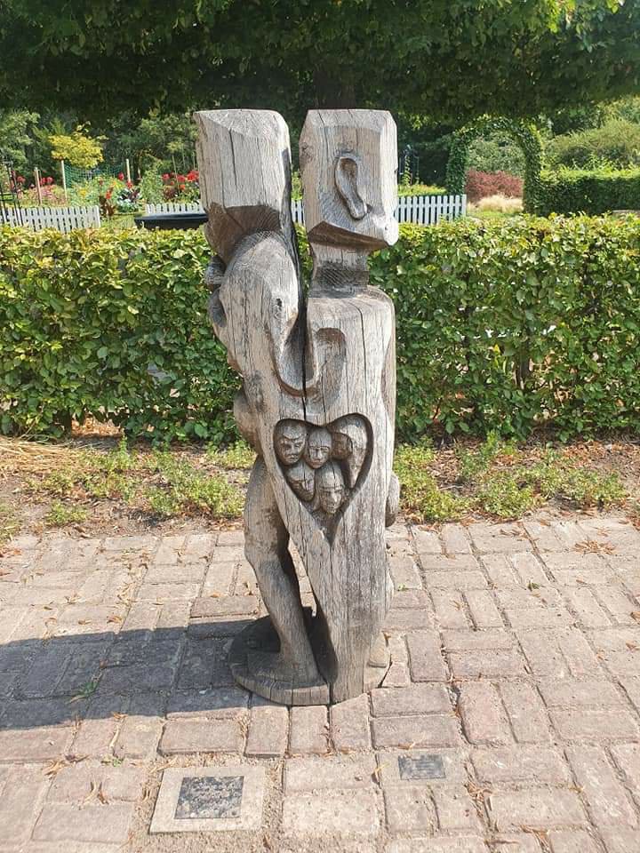 Im Westfalenpark Dortmund, Galerie Torfhaus Skulpturengarten: diese Eichenholzskulptur, die von allen Seiten einen anderen Anblick bietet, mit dem Titel „Adam und Eva, die Entstehung der Menschheit“ wurde vom bosnisch-serbisch-deutschen Künstler Mile Prerad geschaffen