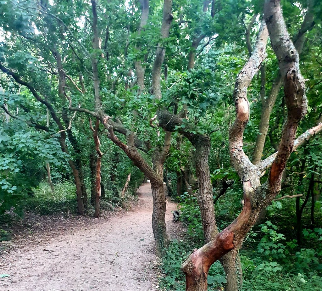 Kunst, die von der Zeeland-Landschaft, Bäume, Meer und Himmel, beeinflusst wurde: Jacoba van Heemskerck, Piet Mondriaan,gefunden im Buch von Veronica Frenks, Badhotel Domburg sinds 1866, im Vergleich mit den Fotos, die ich vorgestern und gestern aufnahm im Wald hinter dem Strand und am Meer