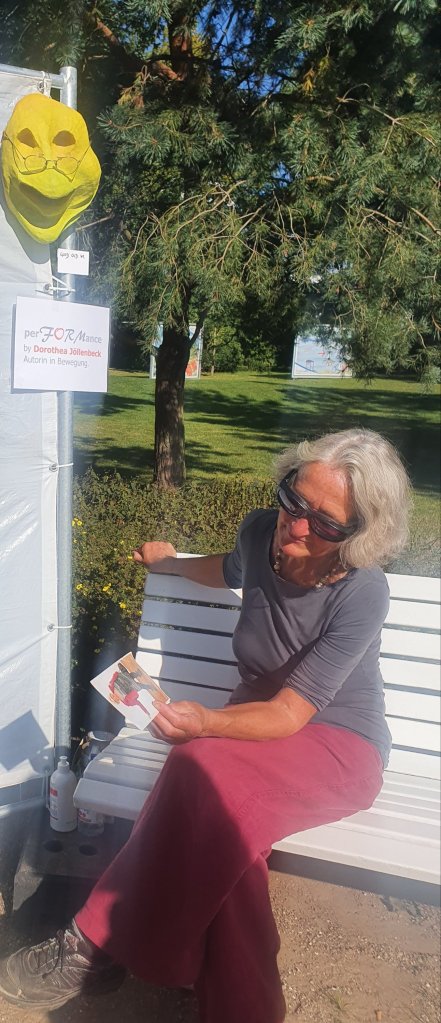 Und noch einmal eine Künstlerin, bei der 1. Cross ART Timmendorfer Strand gesehen: Dorothea Jöllenbeck, Autorin in Bewegung mit ihren spannenden Masken in perFORmance