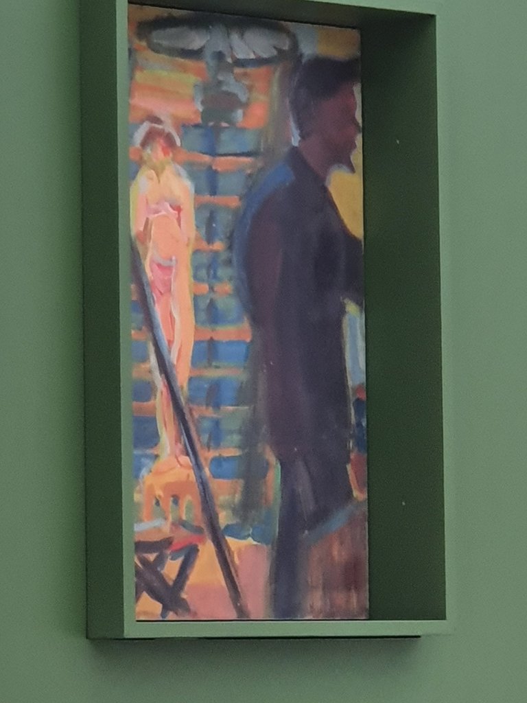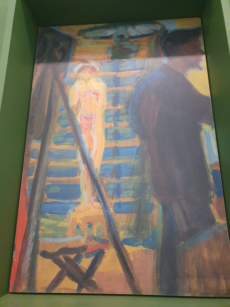 Ernst Ludwig Kirchner, Heckel und Modell im Atelier, 1905 – ein Bild, das während des Architekturstudiums von Kirchner in Dresden entstand – und ein Werk, das schon früh in die Sammlung des Ostwallmuseums Dortmund überging. Zur Zeit ist es im Baukunstarchiv NRW in Dortmund, am Ort des früheren Ostwall Museums zu sehen in der Ausstellung ERNST LUDWIG KIRCHNER, Vor der Kunst die Architektur