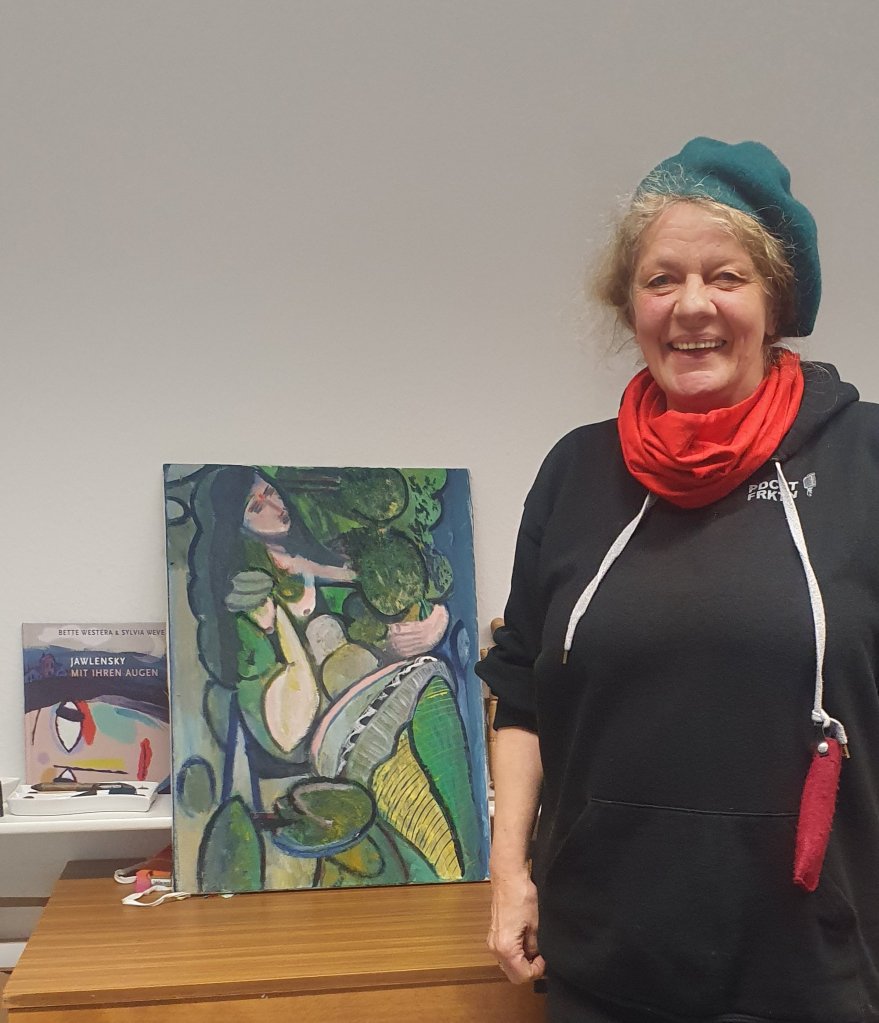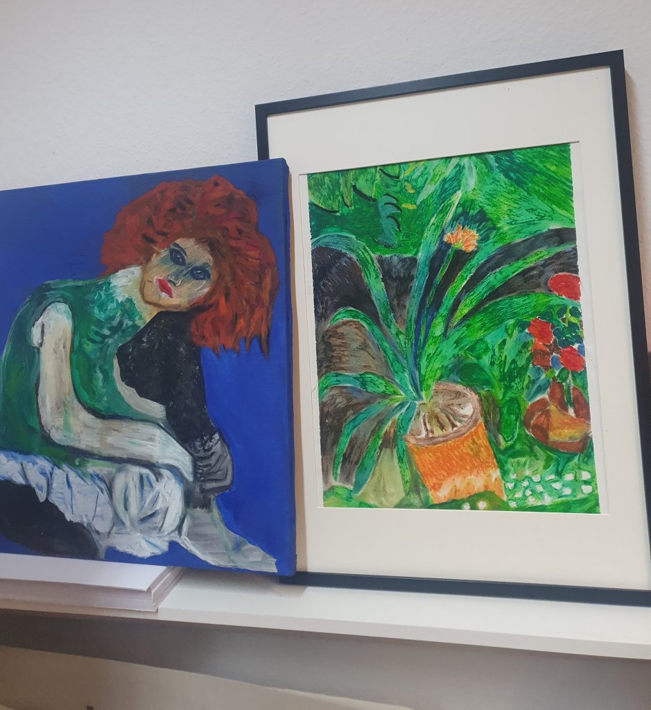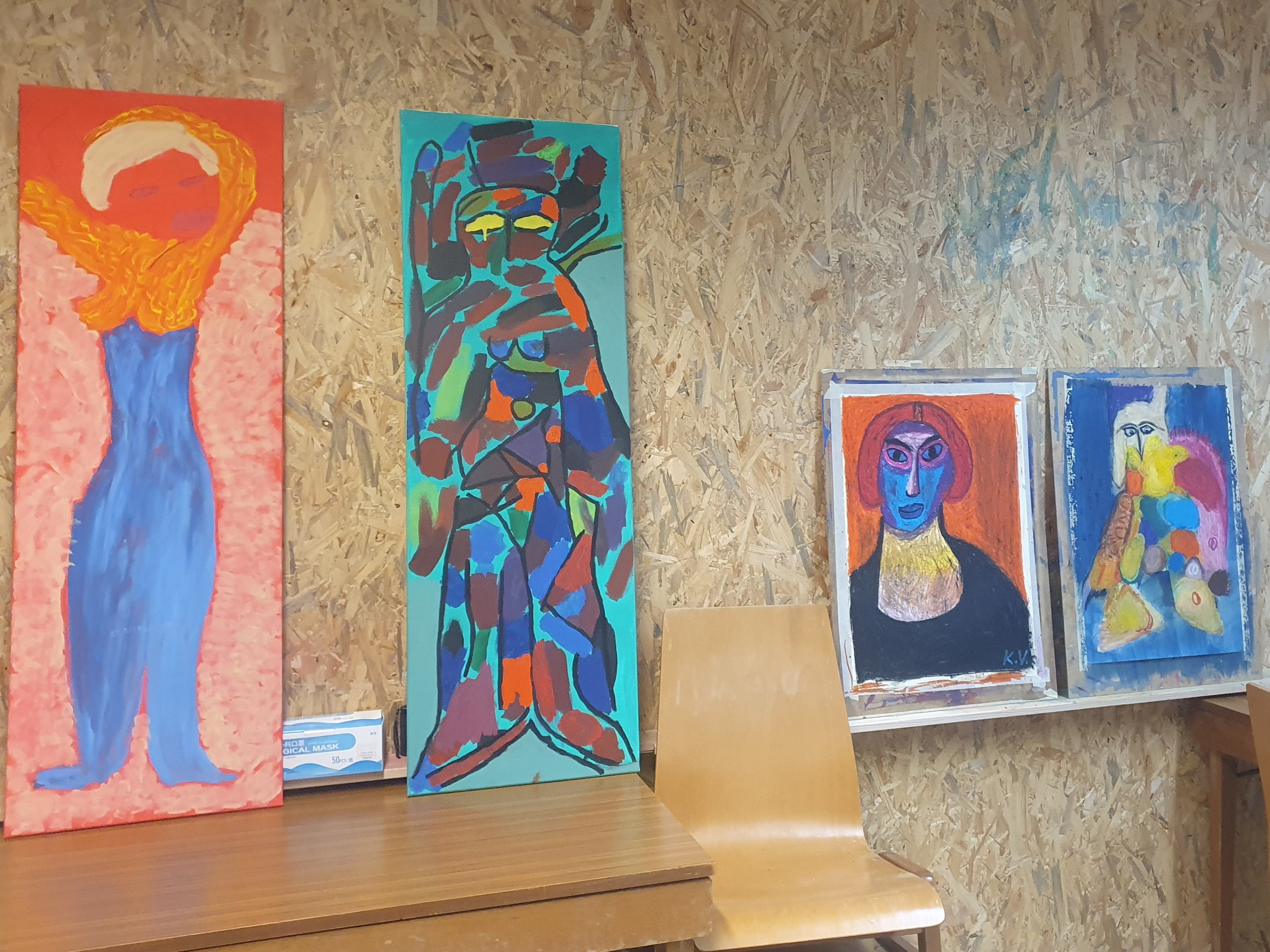 die Kunsttherapeutin und Initiatorin vom Atelier Inklusiv der Integrationsfördergesellschaft, Dorothee Rehkämper-Bach, öffnete die Tür zum Atelier und zeigte uns eigene schöne Werke von #grandiosemgrün und spannende Arbeiten von den Mitwirkenden, deren andere farbenfrohe und reizvolle Bilder wir aus unserer gemeinsamen Ausstellung in der Kunsthalle Am Phönixsee kennen. Dort kann man noch immer einige sehen.