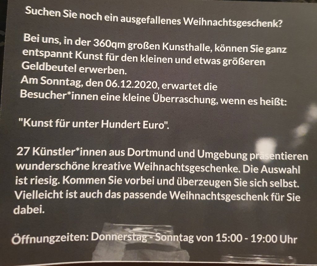 Es wird wieder spannend in der Kunsthalle Am Phönixsee in Dortmund- da wir nicht wie geplant eine Feier am Sonntag, 6.12. zur Eröffnung unserer zusätzlichen Ausstellung „Kunst unter 100 Euro“ gestalten dürfen, sind die Werke unserer (mehr als) 27 Künstler schon vom kommenden Donnerstag an zu sehen und zu kaufen😉