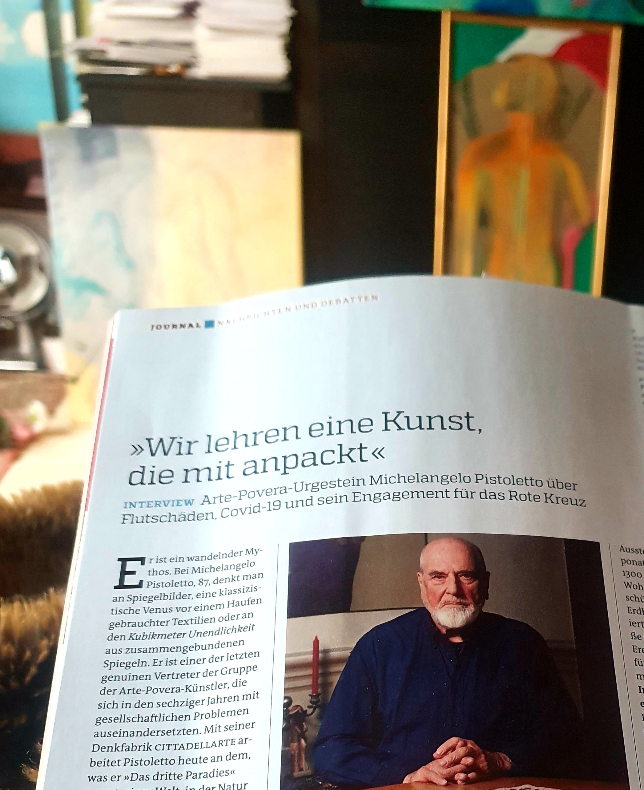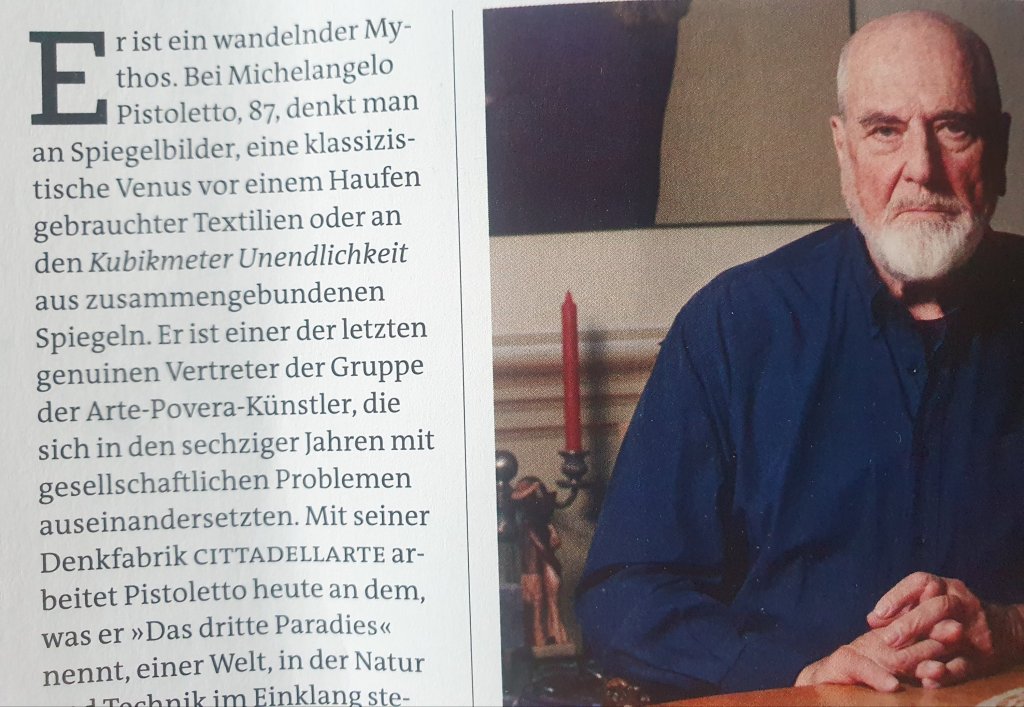 ( homage to Pistoletto by Yvonne Wilken, acrylic on mirror) Im Mai dieses Jahres habe ich meine Hommage an den italienischen, von Covid-19 genesenen 87 jg. Künstler, Michelangelo Pistoletto, der in den 60er Jahren eine wundervolle Spiegelkunst in Italien etablierte und außerdem für seine Skulptur „Venus in Lumpen“ als Ausdruck der #artepovera berühmt ist, auf einen Spiegel aus den 60er Jahren gemalt, im August 2020 dann in der Kunsthalle Am Phönixsee im Rahmen der Ausstellung der italienisch-deutschen Künstlergruppe „Chimera“ gezeigt und erst vor kurzem wieder mit nach Hause genommen. Bei den Gesprächen in der Kunsthalle mit Künstlern und Besuchern, fiel mir oft auf, dass Pistoletto in Deutschland nicht so bekannt ist (ich habe seine Werke auch eher in italienischen Museen gesehen). Daher mein heutiger Hinweis auf einen Artikel mit Interview in ART, DAS KUNSTMAGAZIN, Dezemberausgabe mit dem Zitat “ Wir lehren eine Kunst, die mit anpackt.“