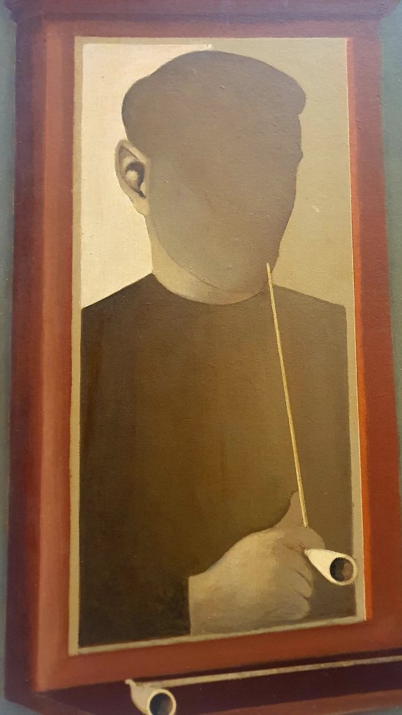 Der Raucher (Selbstbildnis mit Pfeife), gesehen im September in der Kunsthalle zu Kiel, Kasein auf Pappe und Hartfaserplatte. Der Künstler mit den interessanten Materialien wurde im Jahre 1903 in Köln-Lindenthal geboren und starb 1983 in Kiel, wo er als Professor für freie und angewandte Malerei gearbeitet hatte.