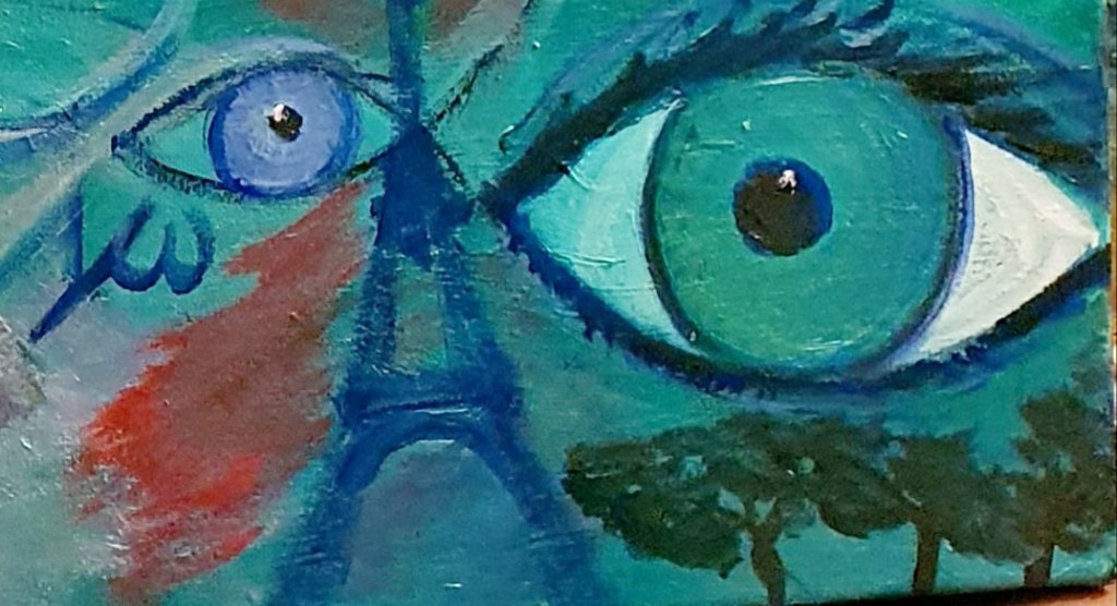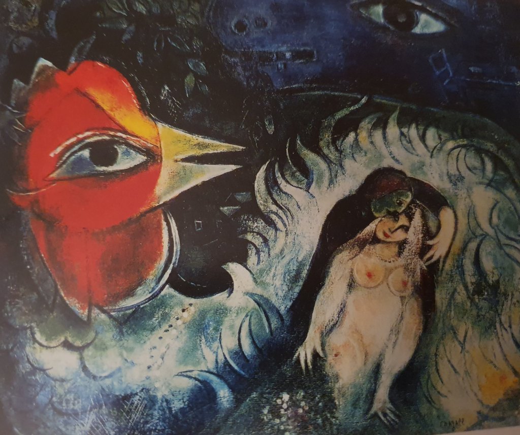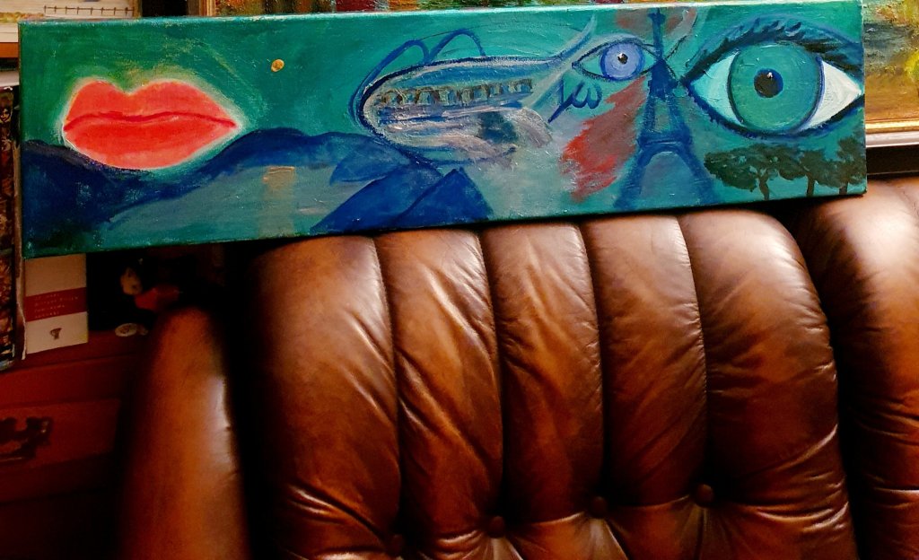 Ich hatte gerade mein Bild „travelling mind“ so gut wie abgeschlossen, (Mund, Auge und Landschaften – verbunden als eine Mischung aus Konzeptkunst und subconscious painting), als ich das Weihnachtspäckchen eines guten alten Freundes bekam: mit einem interessanten, kunstbezogenen Florian Illies Buch und einer Chagall-Grußkarte, die wie mein Bild von zwei Augen dominiert wird.