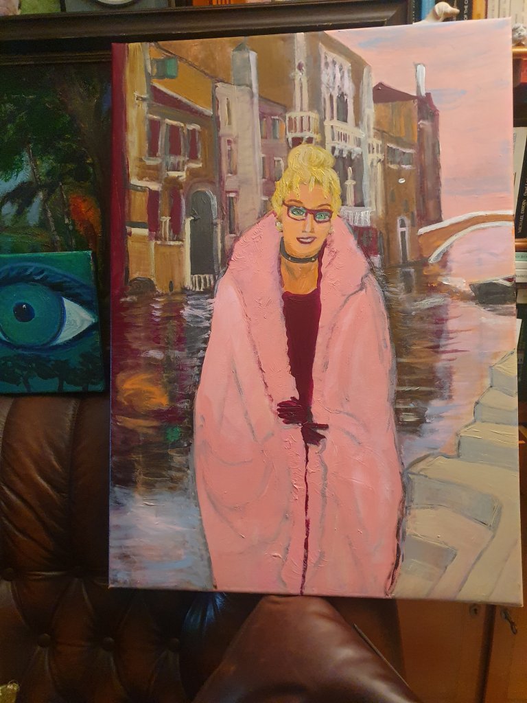 Hommage an den italienischen magischen Realismus der 1920er Jahre/Selbstportrait als „Straniera“/Winter in Venice: acrylic on canvas 50 x 70 by Yvonne Wilken 2020
