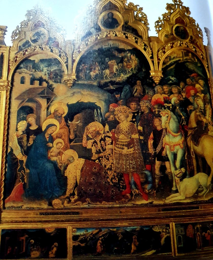 GENTILE DA FABRIANO (1370 – 1427): Die Anbetung der Heiligen drei Könige (1423) – eine detailreiche gotische Arbeit für die florentinische Familie Strozzi, in deren Palast ich eine wundervolle, moderne Ausstellung 2017 sah. Diese Arbeit, die für die Privatkapelle der Familie gedacht war, befindet sich heute noch in Florenz in den Uffizien. Ich habe das Foto allerdings nicht damals dort gemacht, sondern aus dem KUNSTBUCH des Phaidon-Verlags entnommen.
