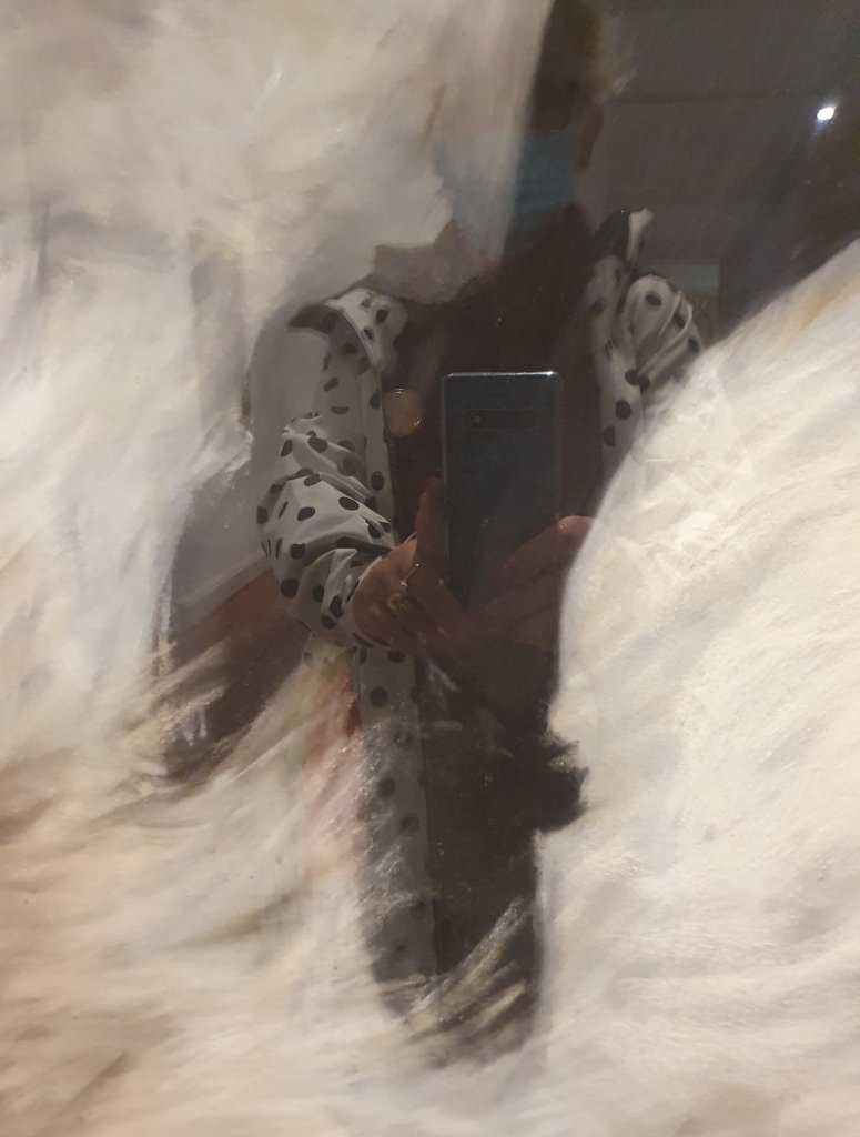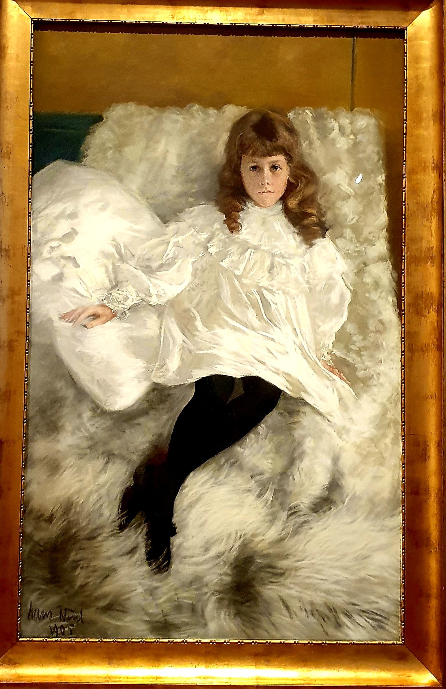 HANS HERMANN WEYL (1863-1916) Anneliese von Arnim als Kind, Pastellkreide auf Leinwand, 1905 – und noch einmal, um die Zartheit der Stoffe aufzunehmen, ganz nahe herangegangen und dabei zufällig mich selbst noch im spiegelnden Glas fotografiert😉 Prinzenpalais Oldenburg, im September 2020