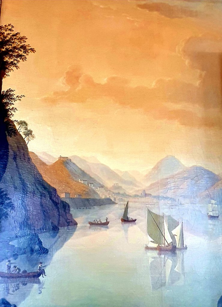 Ludwig Philipp Strack (1761 – 1836, aus derTischbeinfamilie): Bucht von Salerno, (Detail) gesehen @ Augusteum, Oldenburg (#yvonnewilkenphotography 9/2020): Stracks Malweise erinnert fast an japanische Arbeiten in ihrer Zartheit und den Pastellfarben Aprikose, Türkis und ein lichtes Blau…