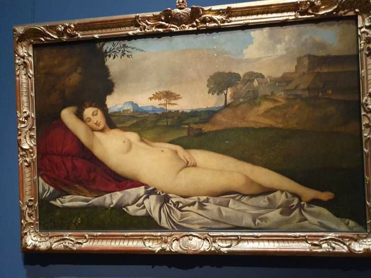 Ich habe eine neue Kategorie des Blogs gefunden und nenne sie, weil mir auf der Suche nach den vor langer Zeit geknipsten Fotos immer wieder ein noch viel älterer Song einfiel mit dem Refrain: „…and Venus was her name“. Venus huschte ja häufig über die Leinwände alter Meister, und so beginne ich mit dem Bild, das ich in der Gemäldegalerie der alten Meister (noch unrenoviert) in Dresden im August 2019 fotografierte: von Giorgione begonnen, nach dessen plötzlichem Tod im selben Jahr von Tizian vollendet: die „schlummernde Venus“ von 1510 .