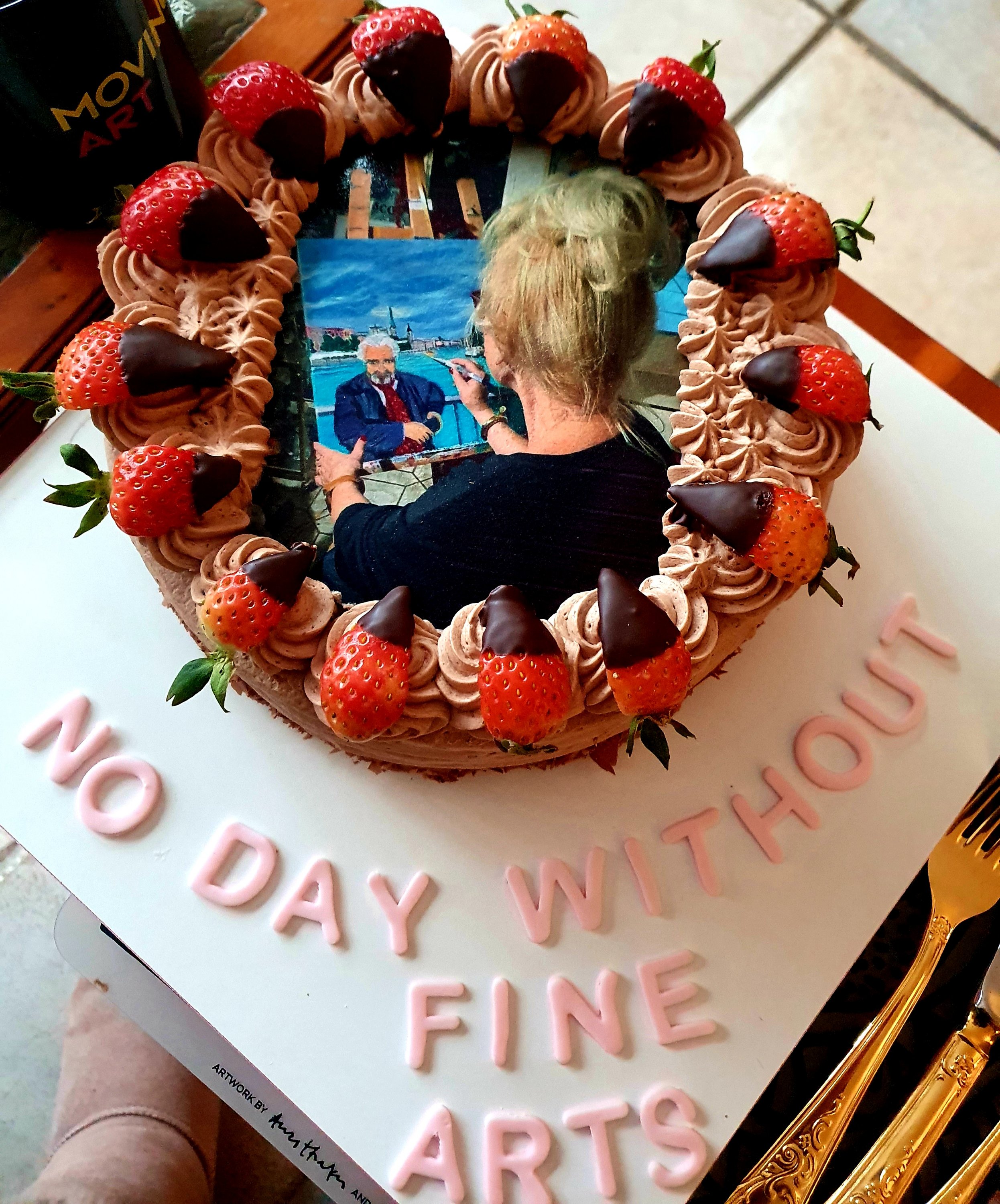 Mein Slogan, ein Foto aus meinem Atelier, als ich gerade das Zürichgemälde male (Fotograf:Robert Kahnt, Zürich), eingearbeitet in eine Torte mit Erdbeeren und Nougatcreme – ein Wunderwerk von Sonja Mohr aus Wellinghofen und mir zum Geburtstag geschenkt von meiner lieben Freundin Silke Albrecht: eine gelungene Überraschung der Backkunst.