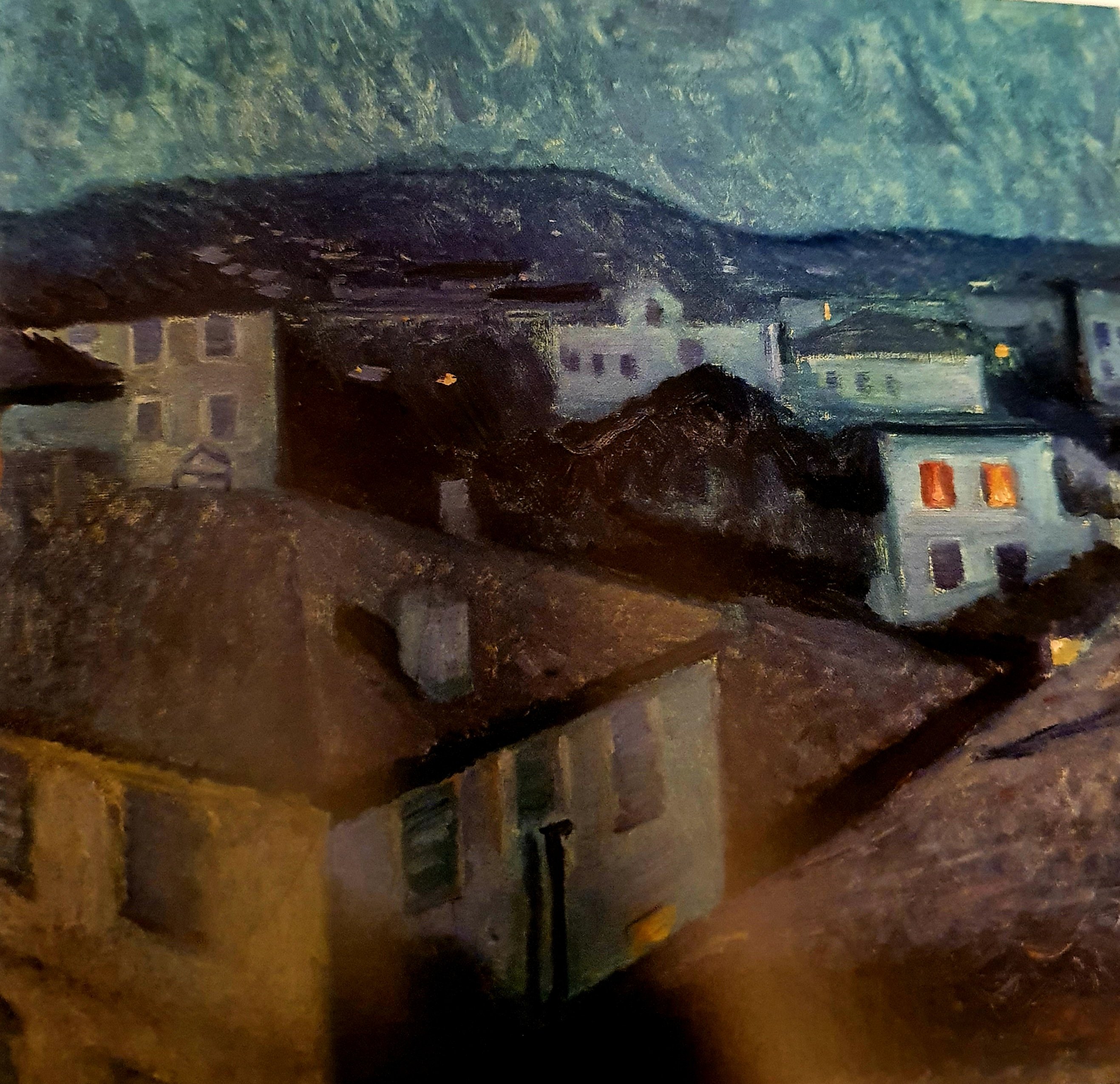 Es ist ein französisches Sujet eines norwegischen Künstlers, gefunden im Buch über einen anderen norwegischen Künstler: das 1. Bild, das die Osloer Nationalgalerie von ihm kaufte: EDVARD MUNCH, Nacht in Nizza, 1891 – der „Hingucker“ sind die wenigen beleuchteten Fenster…(Harald Sohlberg – unendliche Landschaften, Katalog zur Ausstellung im Wiesbadener Museum 2019
