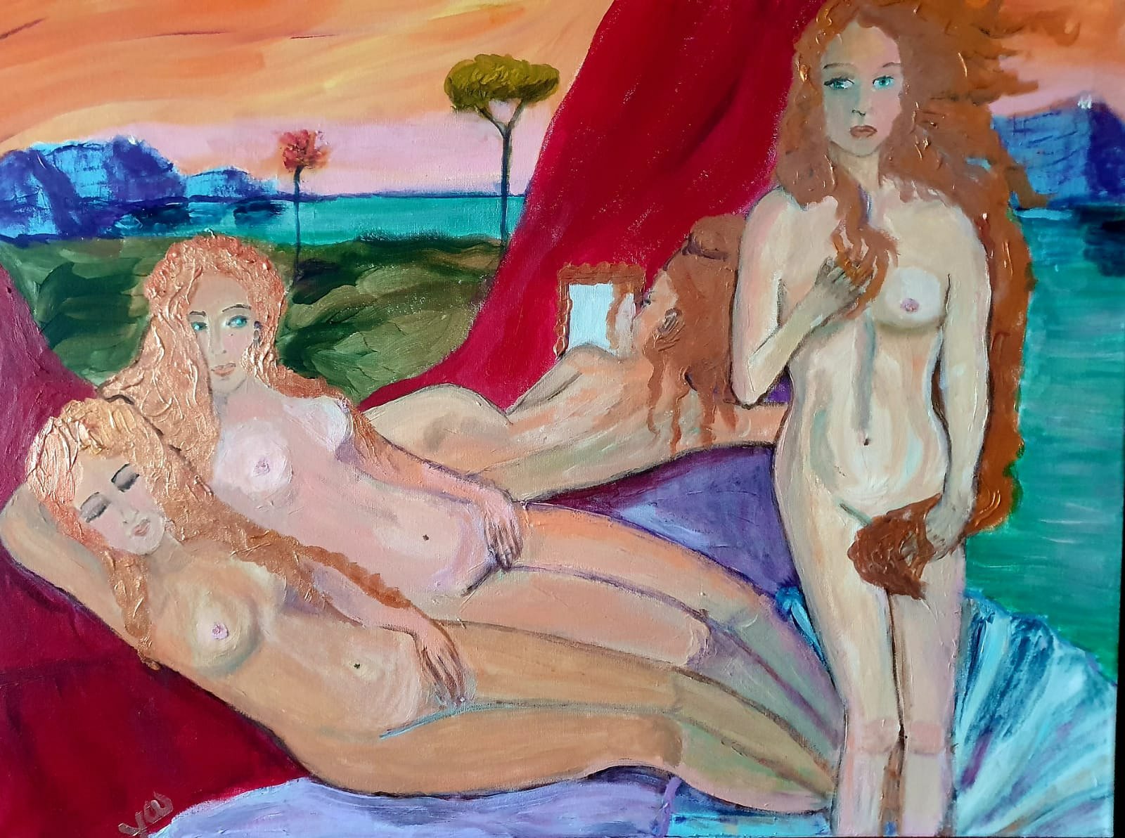 Yvonne Wilken, Hommage (30) an Giorgione, Tizian, Velasquez und Botticelli, Acryl auf Leinwand 80 x 60: ich habe die Venusdarstellungen, die ich ja Anfang Februar hier vorgestellt habe (15.-17.Jahrhundert), immer schon geliebt und hatte den dringenden Wunsch, sie zu kopieren, dabei etwas zu modernisieren und sie ein wenig anzugleichen, so dass man das Bild auch noch anders lesen könnte: nur eine Venus ist zu sehen: sie schläft, wacht auf, schaut in den Spiegel und steht etwas fröstelnd auf…