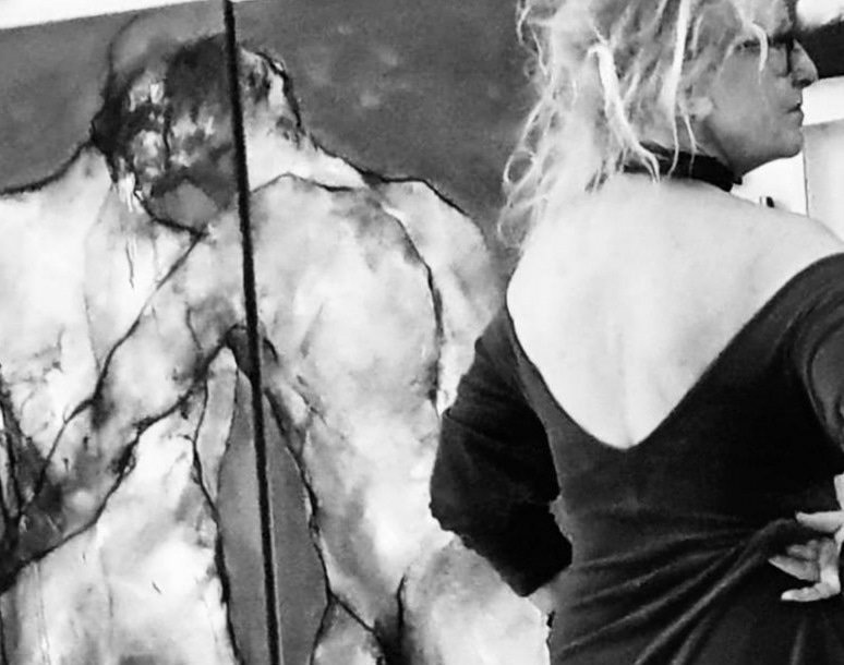 In front of ART (82) by Martine Chaperon (Grenoble), private collection: Diptychon „les deux“ und ich davor in einer ähnlichen Haltung mit Rückendekolleté (similar but not the same)